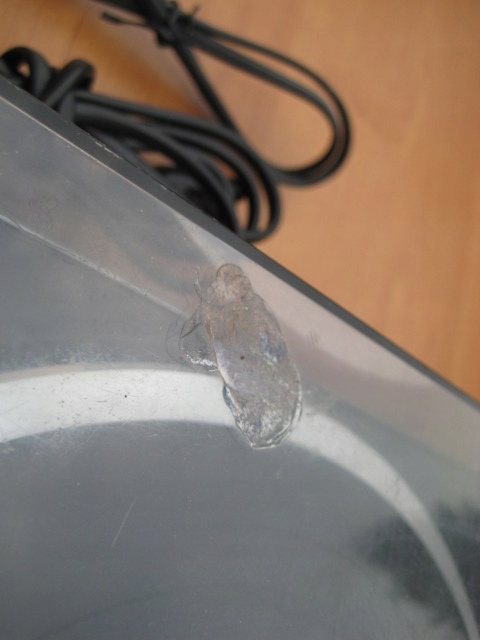 Gramofon ma ślady użytkowania. Pokrywa jest porysowana – powiedziałbym do polerowania. Po lewej stronie na pokrywie małe znamię.