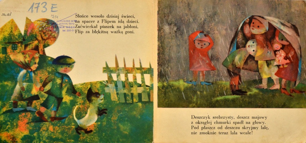 Stan: dobry; książka wycofana ze zbiorów przedszkolnej biblioteki (na odwrocie przedniej okładki pieczątki i adnotacje biblioteczne), na okładce podpis, zagięte dolne rogi kartek, otarcia przybrudzenia i zagięcia rogów okładki, pożółkłe i przybrudzone kartki