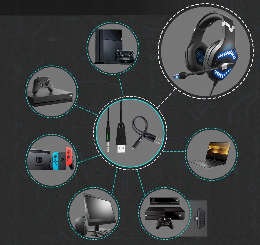 Zestaw słuchawkowy Onikuma zapewnia kompatybilność z większością urządzeń dostępnych na rynku (pełne okablowanie w zestawie!)
