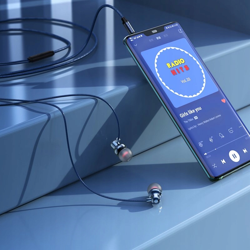Uniwersalne słuchawki dokanałowe z mikrofonem, kablem o długości 1.2 m, złączem audio minijack 3,5 mm oraz pojedynczym klawiszem sterującym do muzyki i połączeń.