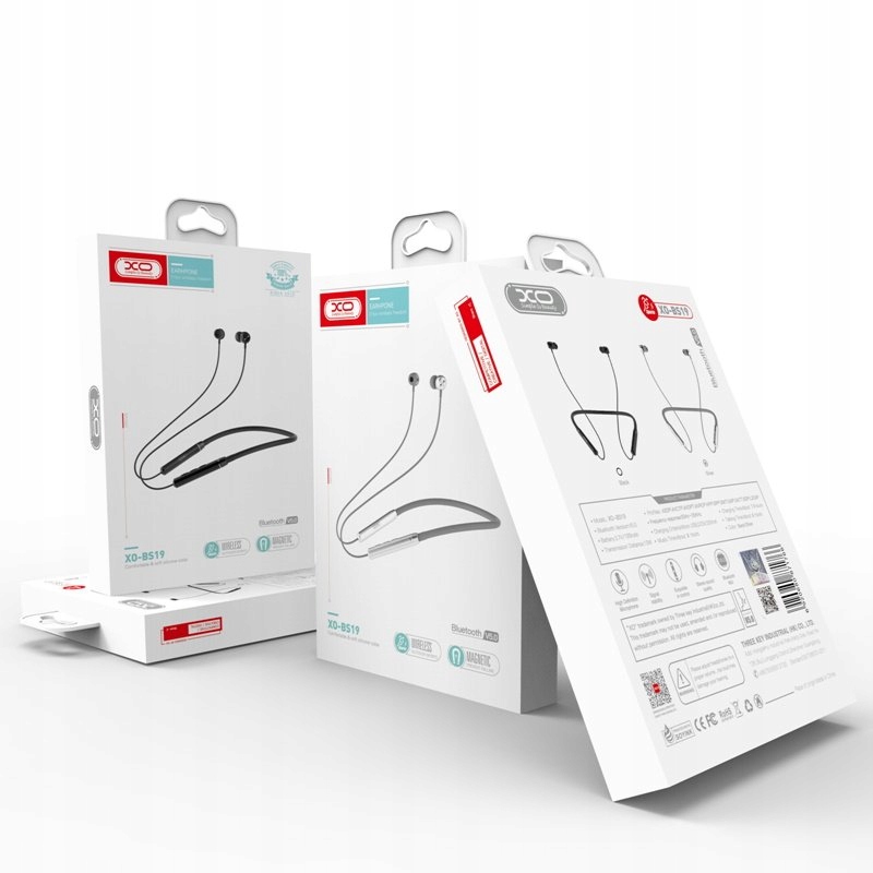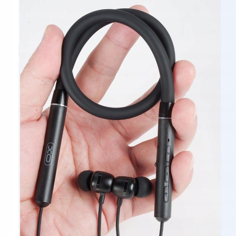 Słuchawki dokanałowe w technologii Bluetooth 5.0 z elastycznym silikonowym plastycznym pałąkiem na szyję.