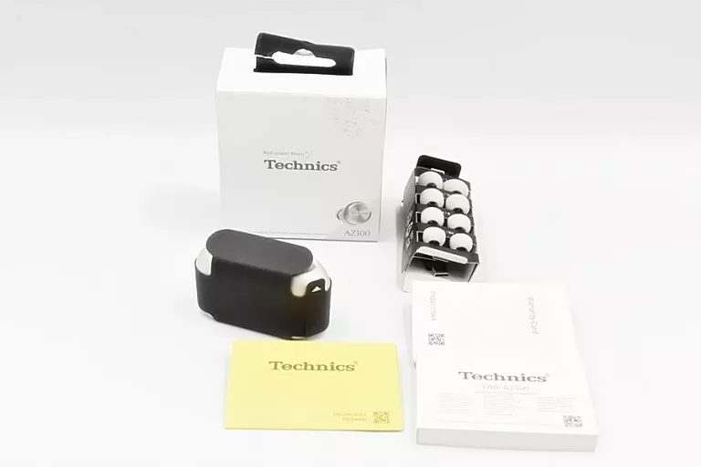 Słuchawki dokanałowe TECHNICS EAH-AZ100E-K ANC, wymienne nakładki, kabel USB-A/USB-C, etui ładujące (USB-C) i dokumentacja.
