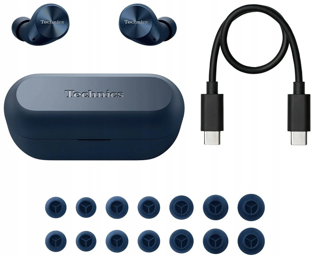 - Funkcje dodatkowe: Aplikacja Technics Audio Connect, Dekodowanie AAC, IPX4, Kodek LDAC, Multi-point, Odbieranie połączeń, Przełączanie między utworami, Szybkie ładowanie, Zasięg: 10 m