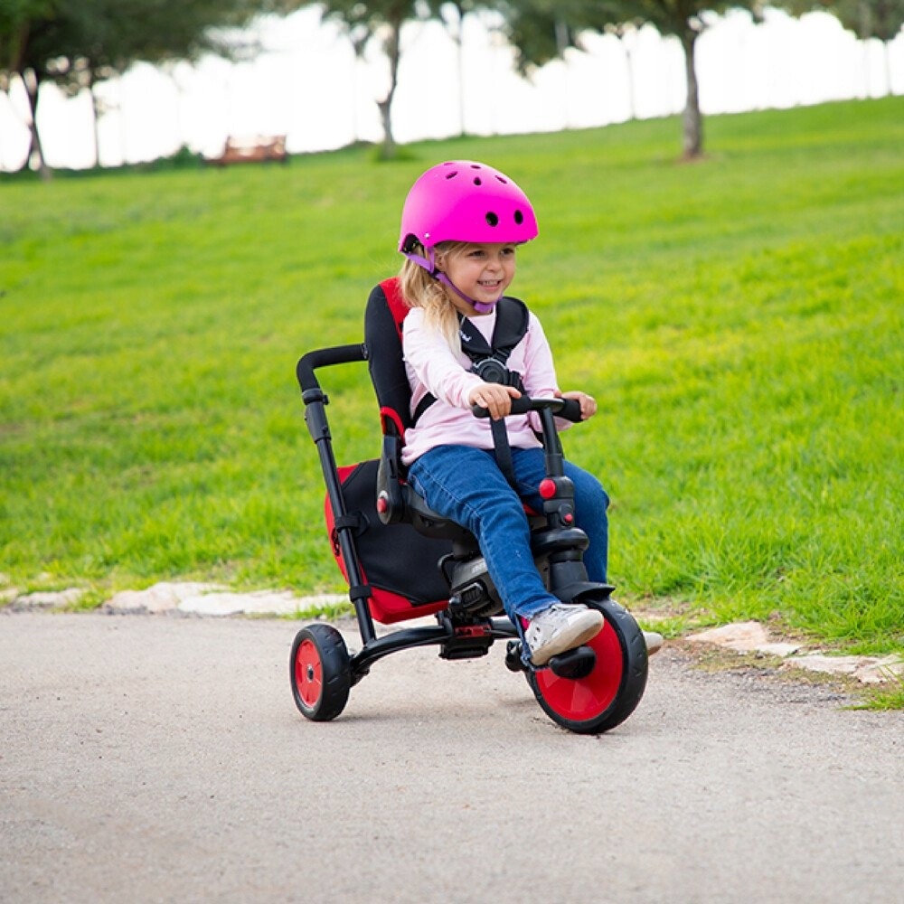 5-punktowe szelki bezpieczeństwa i pałąk bezpieczeństwa z możliwością wypięcia zapewniają dziecku odpowiednie zabezpieczenie podczas jeżdżenia rowerkiem.
