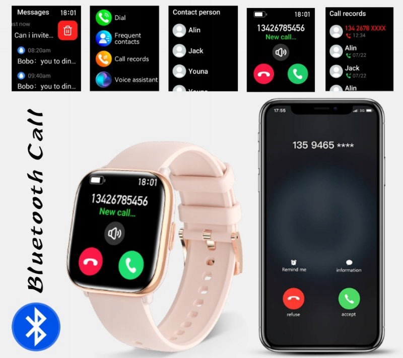 Nie musisz szukać telefonu w torebce – Bluetooth Call, wbudowany mikrofon i głośnik sprawiają, że odbierasz połączenia jednym dotknięciem, swobodnie i wygodnie, gdziekolwiek jesteś. Czarny silikonowy pasek otula nadgarstek niczym druga skóra, dopasowując się do każdej sytuacji – od biurowego spotkania po wieczorny spacer.