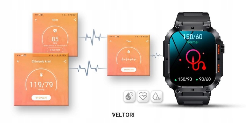 Dzięki sensorowi możesz w każdej chwili zmierzyć lub wykonać pomiar: ciśnienie krwi, tętno lub saturację - zawartość tlenu we krwi w swoim organizmie. Kontroluj wyniki podczas każdej aktywności fizycznej. Niezależnie czy jeździsz na rowerze, biegasz, czy też po prostu jesteś w pracy lub odpoczywasz. Twój smartwatch Veltori stanie się osobistym asystentem dbającym o twoje zdrowie każdego dnia.