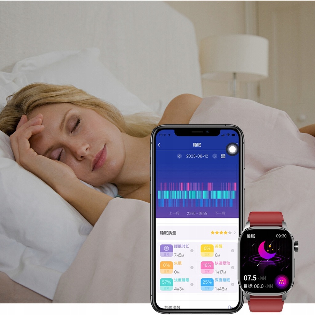 - Zaawansowana analiza snu: Wykorzystując sensor akcelerometru oraz monitor tętna, smartwatch śledzi wzorce snu użytkownika. Rozróżnia fazy snu, w tym lekki, głęboki oraz REM, co umożliwia precyzyjną analizę jakości snu.