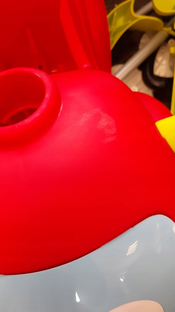 Zdejmowany ochronny pierścień bezpieczeństwa i podstawka bujająca, regulowana rączka, pasy bezpieczeństwa, ruchome oczy sterowane przez dziecko. Elektroniczny klakson. Schowek pod siedziskiem. Łatwy w montażu.
