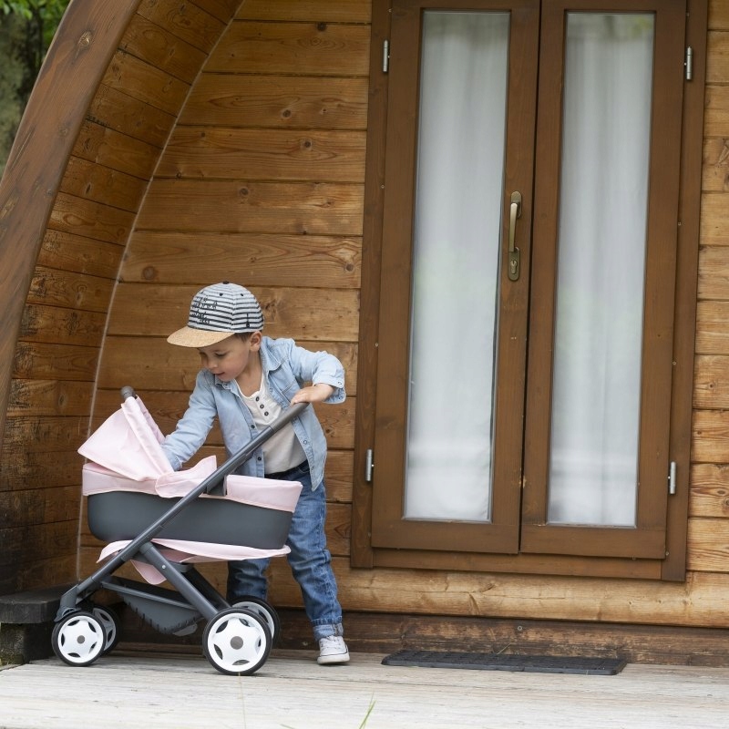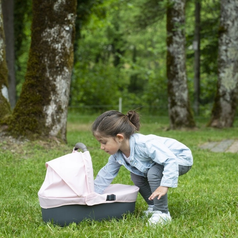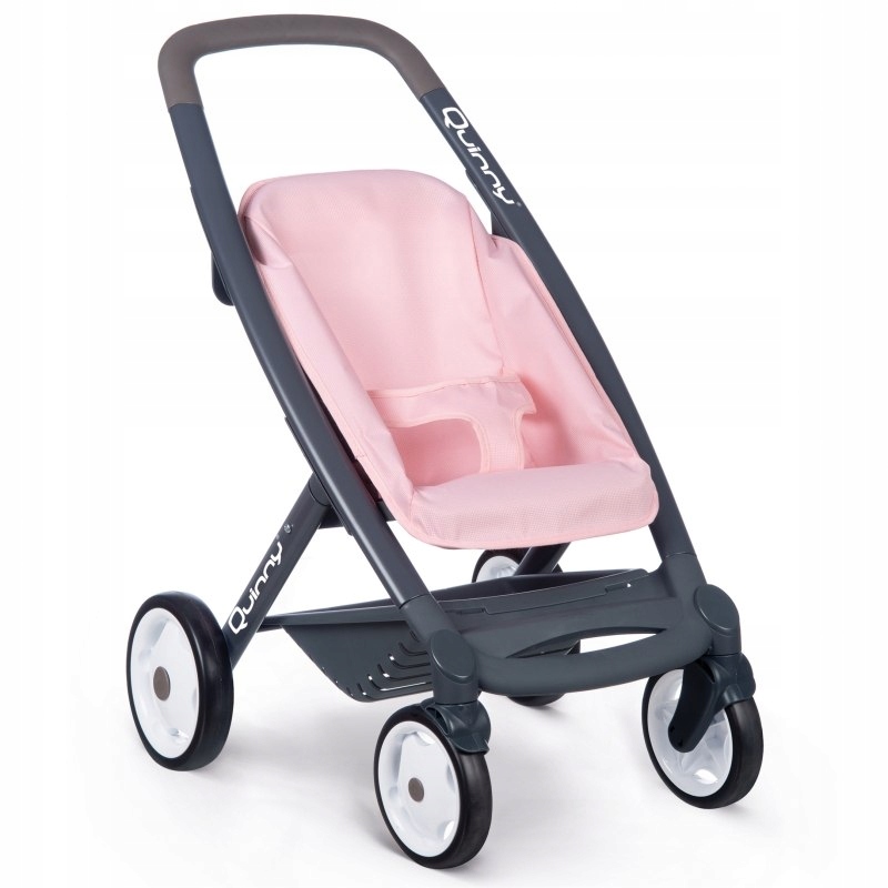 Ten śliczny wielofunkcyjny wózek dla lalek stylizowany jest na wózkach Maxi Cosi Quinny o nowoczesnej stylistyce. Wózek jest niezwykle stabilny, a skrętne przednie kółka zapewniają łatwość prowadzenia i wygodę podczas zabawy. Ciche koła z gumowymi oponami wpływają na komfort jazdy. Wózek daje dziewczynkom możliwość urozmaiconej zabawy, dzięki opcji zmiany nadwozia na spacerówkę lub gondolę. Spacerówkę wyposażono w pasy bezpieczeństwa, którymi można zapiąć lalkę, gondolę natomiast w pokrowiec i opuszczany daszek. Stelaż wózka posiada wygodną rączkę, na wysokości 64 cm. Wózek przeznaczony dla lalek 42 cm.