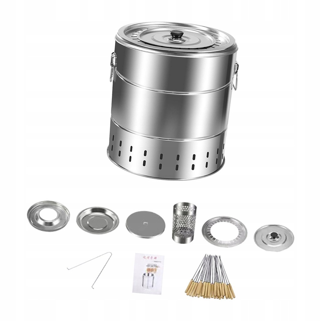 Package Includes:1 Roasting Grill, 20 Steel Skewers, 1 Oil Collection Tray, 1 Ash Collection Tray, 1 Bucket Lid, 1 Bucket, 1 Skewer Rack, 1 Furnace Cover, 1 Handlebar Set, 1 Instruction Manual, 1 Grill Net, 1 Stringing Device, 1 Barbecue Clip, 1 Oil Brush
