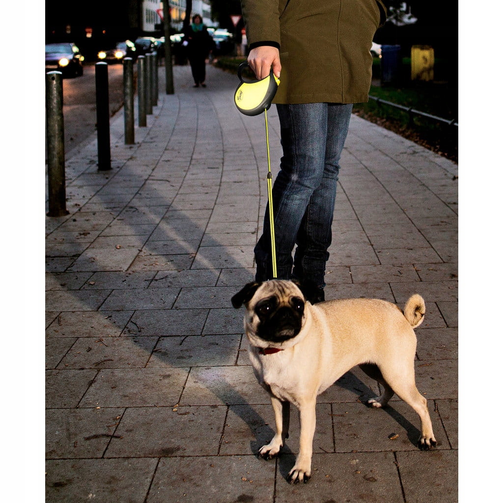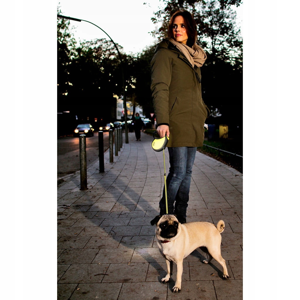 Długość linki smyczy to 5m, co zapewnia psu dużą swobodę i wygodę ruchów. Przycisk hamulca umiejscowiony na smyczy umożliwia regulację odległości od pupila.