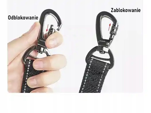 Pozwala w szybki sposób zapiąć, lub rozpiąć smycz, jednocześnie uniemożliwiając przypadkowe wypięcie się mocowania.