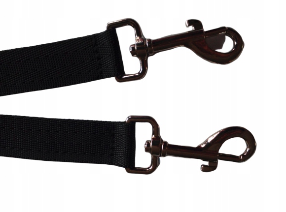 Smycz posiada dwa solidne karabińczyki oraz grube matalowe półkole co umożliwia regulacje smyczy .