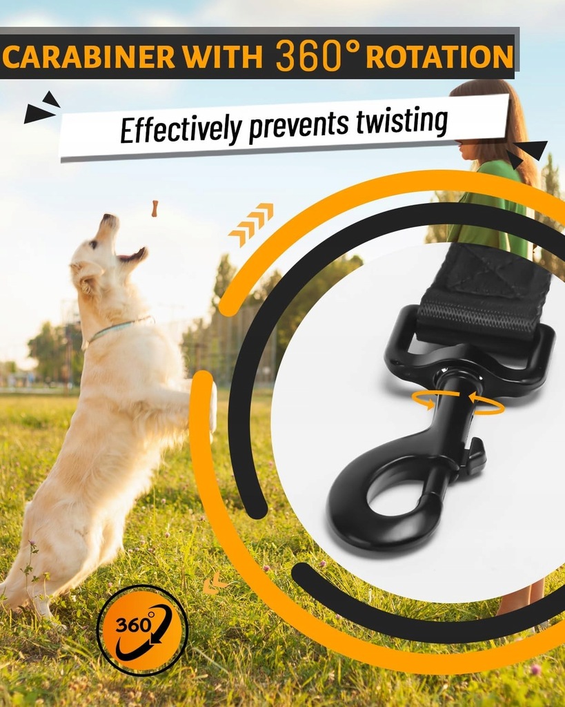 ✅Wolny obrotowy hak: Wysokiej jakości metalowy hak długiej smyczy szkoleniowej dla psów wytrzymuje siłę ciągnięcia 250 kg. Ma niezwykle wysoką nośność, aby zapobiec puszczaniu psa. Elastyczna konstrukcja obrotowa 360° pomaga również zapobiegać zaplątywaniu się i wiązaniu, skutecznie zmniejszając ryzyko.