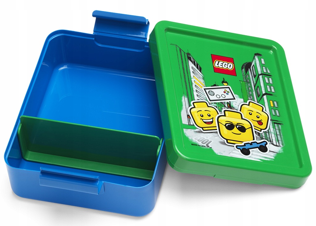 Lunchbox ozdobiony jest współczesnymi grafikami z motywami LEGO®, które trafiają w gustach nawet najbardziej wymagających fanów klocków. Wieczko tego lunchboxa (dzięki wygodnym klipsom) może służyć jako odlotowy talerzyk.