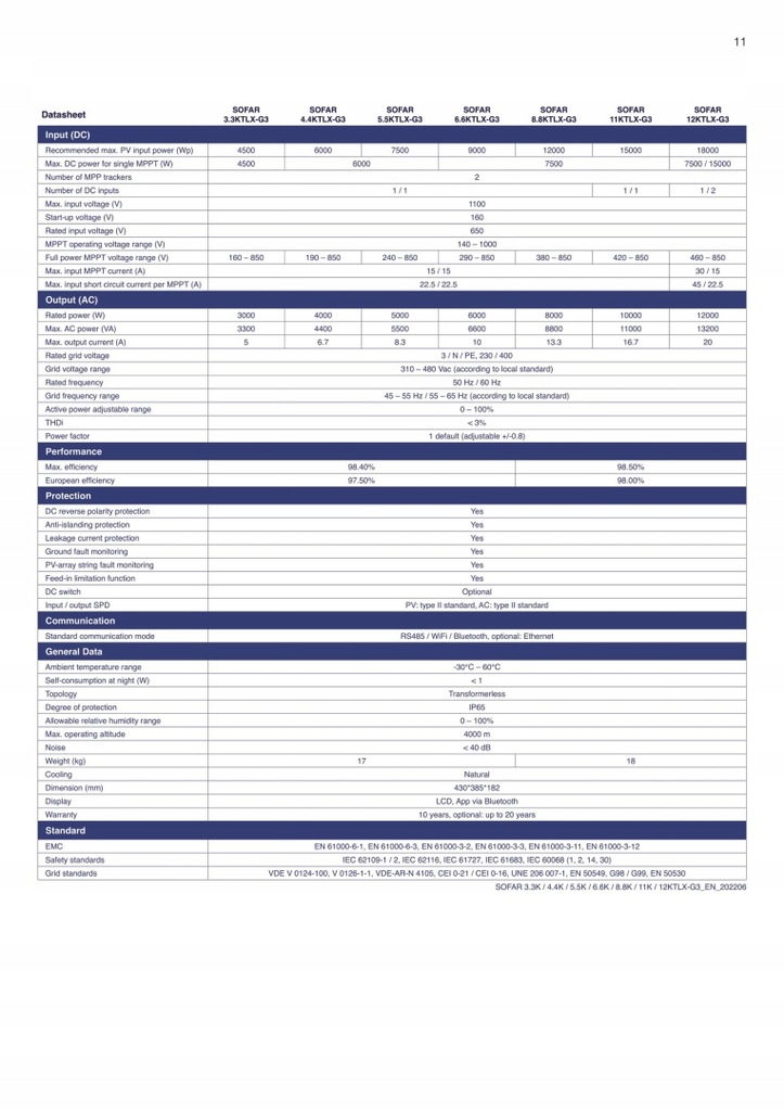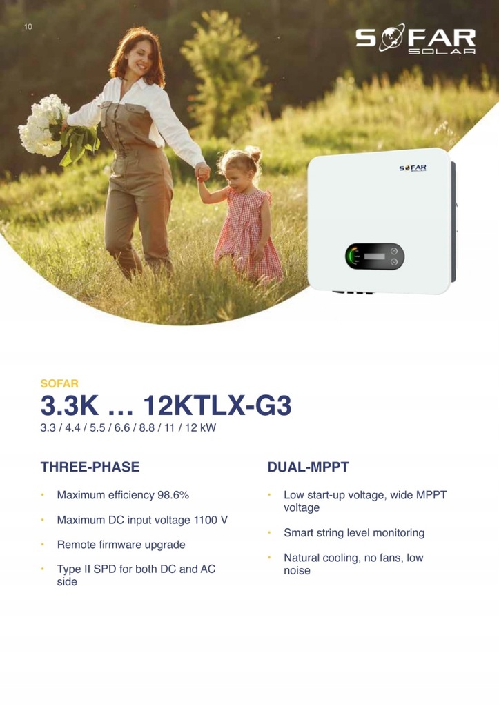 SOFAR 8.8KTL-X-G3 trójfazowy inwerter posiada SPD typu II dla prądu DC i AC, inteligentny monitoring stringów, a jego maksymalna wydajność wynosi 98,6%.