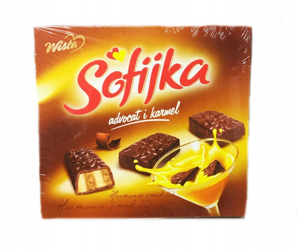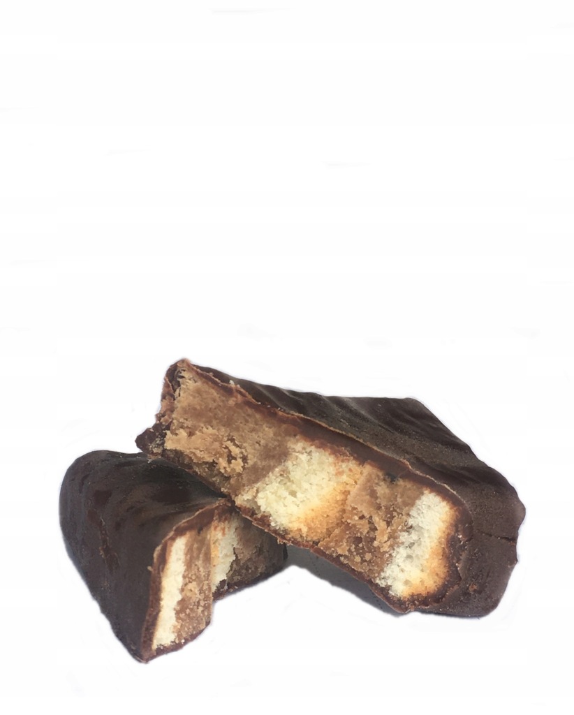 Ciasto biszkoptowe o smaku likieru jajecznego z lekką nutą alkoholu, przekładane warstwą karmelową, oblane czekoladą