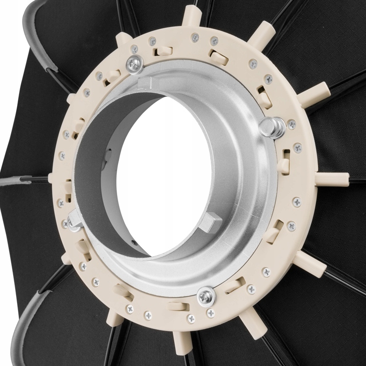 Modyfikator został wyposażony w obracany pierścień mocowania w standardzie Bowens, dzięki czemu będzie pasował do większości lamp dostępnych w sprzedaży (Jinbei, Aurora, Freepower, Quadralite itd.)