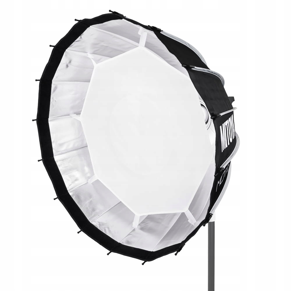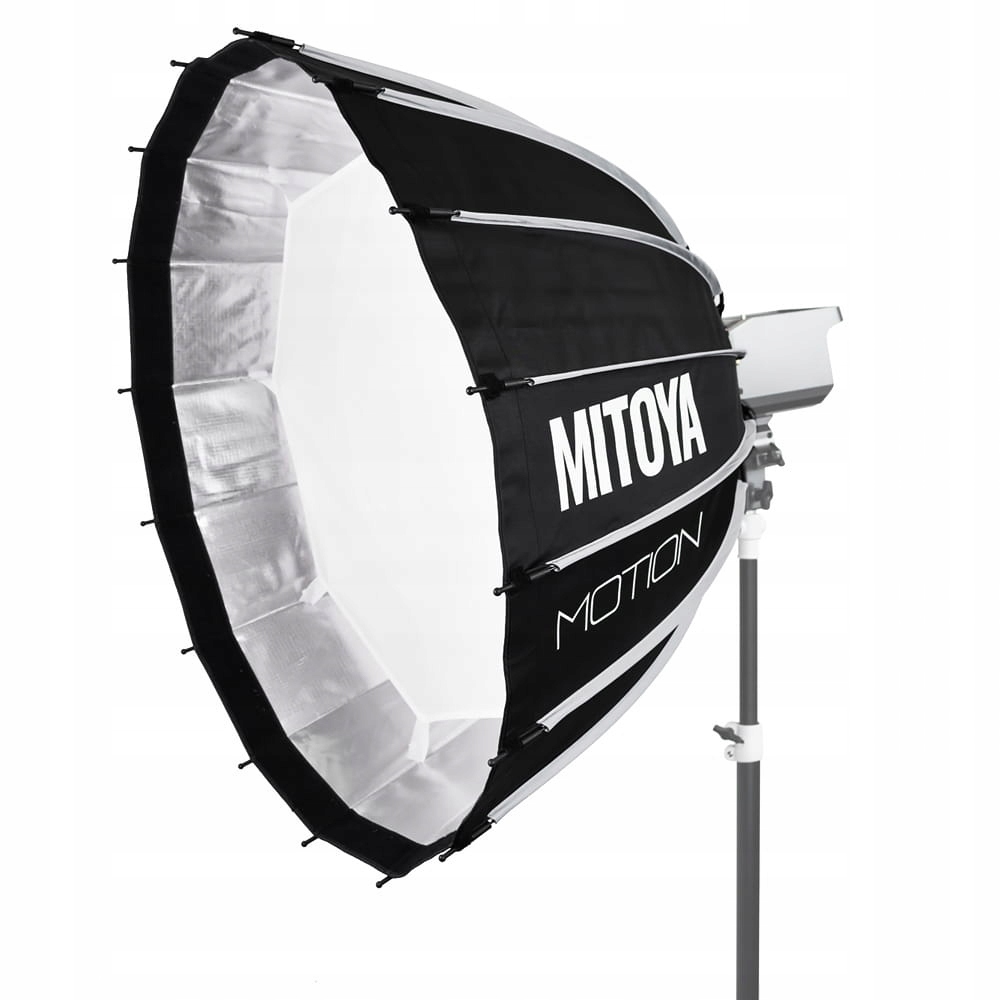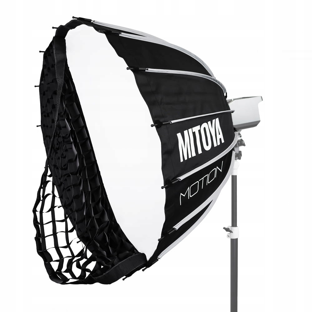 Szesnastokątny, paraboliczny softbox MITOYA MOTION o średnicy 85 cm ze zintegrowanym mechanizmem szybkiego rozkładania oraz adapterem systemu Bowens. Stelaż poprowadzony na zewnątrz czaszy oferuje przestrzeń pozbawioną metalowych elementów konstrukcyjnych, które mogłyby zasłaniać palnik lampy. Pozwala to na swobodną pracę zarówno z lampami błyskowymi, jak i lampami światła stałego LED. W zestawie dwa dyfuzory, grid oraz pokrowiec.