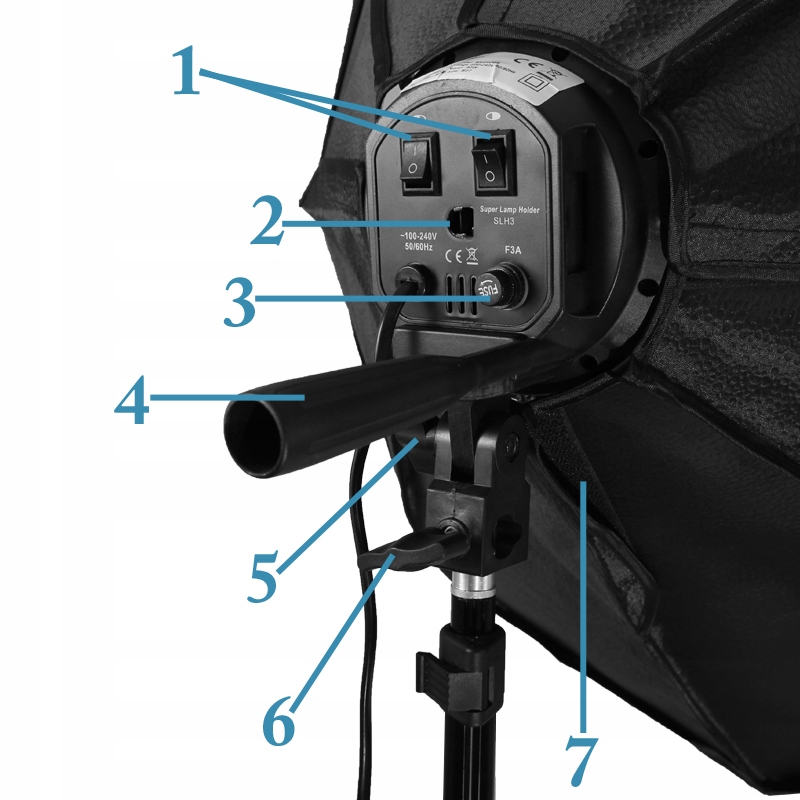 Solidny i estetyczny softbox oktagonalny na 4 żarówki E27 z dwoma przełącznikami na dwie żarówki każdy oraz dyfuzorem wewnętrznym i zewnętrznym, montowany na statywy studyjne 16 mm. Pozwala na rozproszenie światła żarówek błyskowych lub światła stałego (ciągłego), stanowi dobrą alternatywę dla parasolek czy softboxów studyjnych.