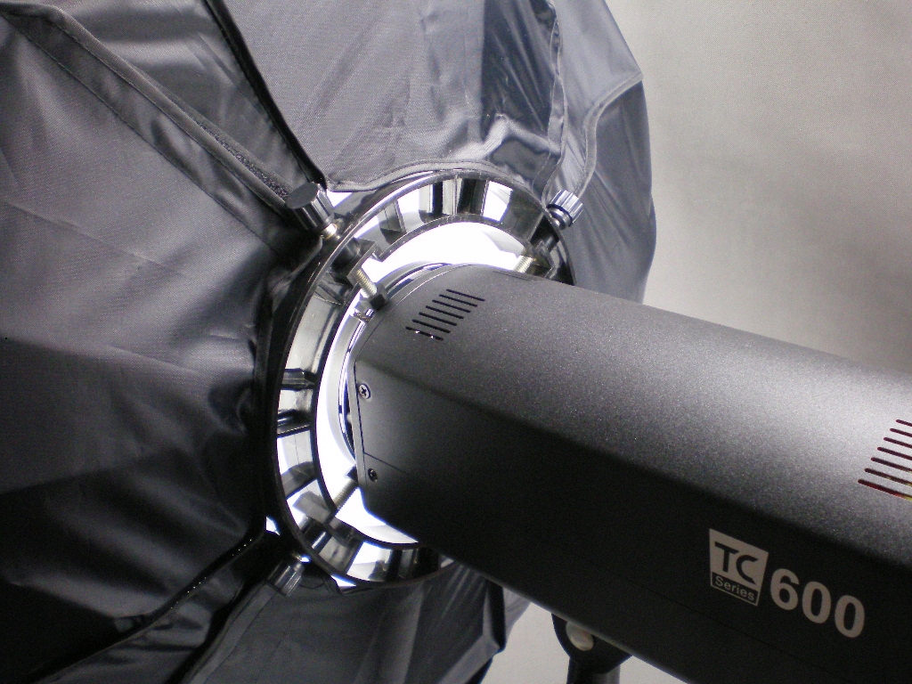 Softbox mocuje się do główki lampy za pomocą plastikowego adaptera za pomocą czterech śrub.
