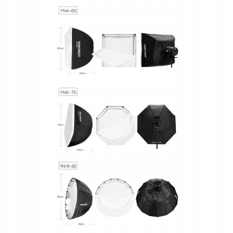 Zawartosc zestawu - 1 x softbox Yongnuo YN4-60 - 1 x pierscien mocowania typu Bowens - 4 x metalowy drut - 2 x tkanina dyfuzyjna - 1 x pokrowiec na softbox i akcesoria
