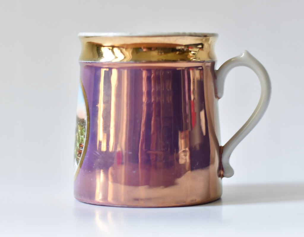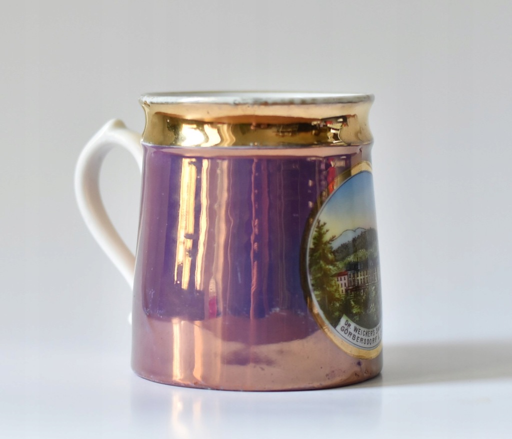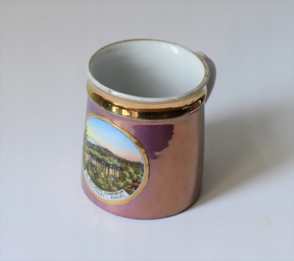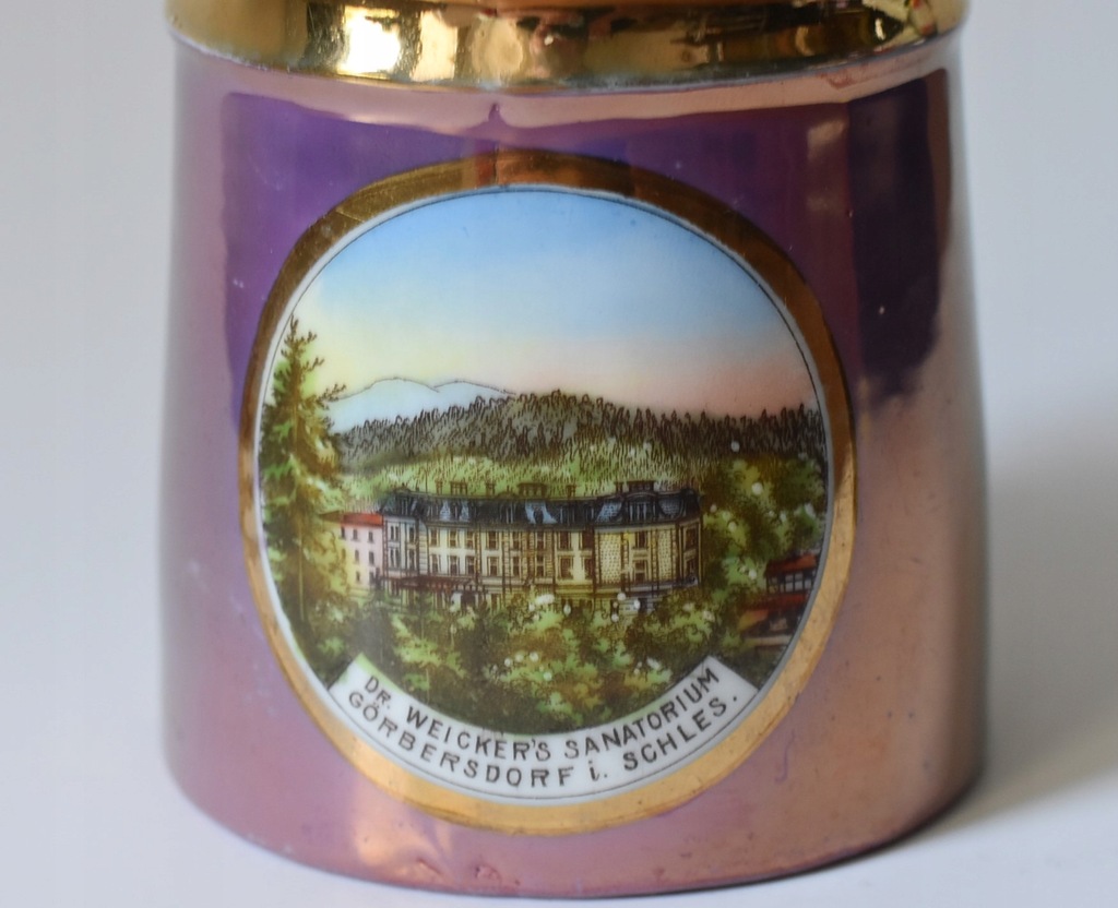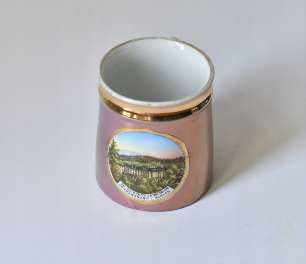 Pamiątkowy kubek z wizerunkiem na sanatorium dr Wickersa w Sokołowsku (napis w języku niemieckim Dr. Weicker's Sanatorium Görbersdorf i. Schles.).
