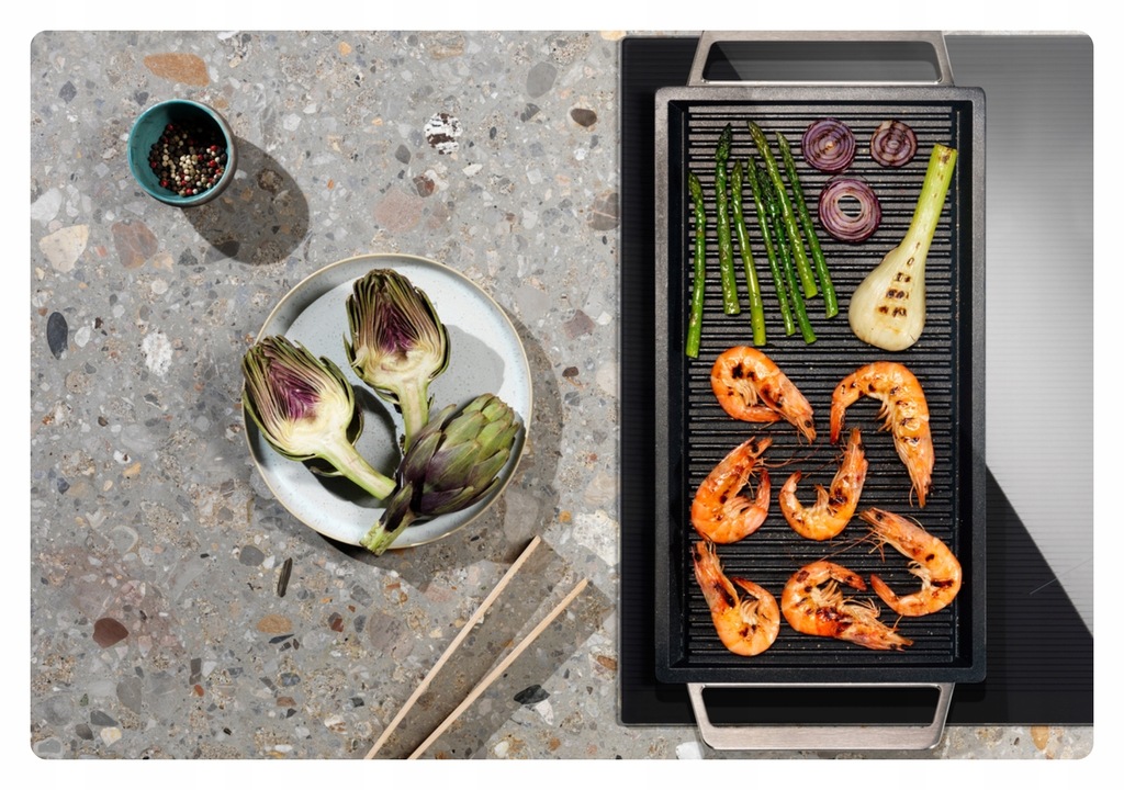Na płycie z funkcją Flex Bridge gotuje się wygodniej. Trzy opcje układu pól grzejnych umożliwiają większą elastyczność, gdy korzystasz z kilku różnych naczyń jednocześnie. Możesz wybrać dwa pola średniej wielkości, jedno małe i jedno duże lub jedno bardzo duże do grillowania „a la plancha”.