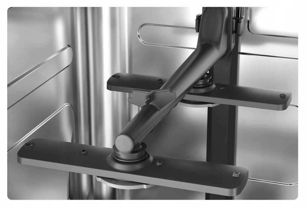 Dwa rotacyjne ramiona spryskujące sprawiają, że wszystkie naczynia są idealnie czyste, ponieważ woda jest równomiernie rozprowadzana po całym urządzeniu.