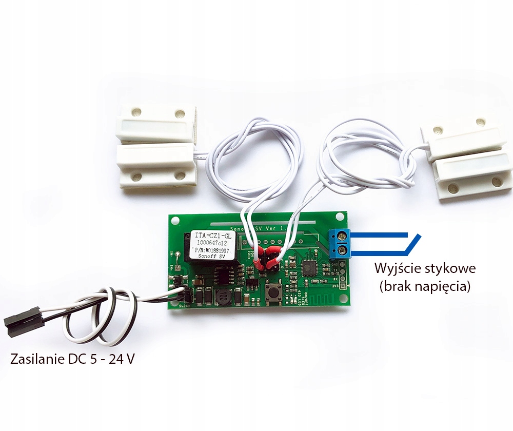 Aukcja dotyczy niskonapięciowego przekaźnika Sonoff SV sterowanego przez WiFi w wersji bez napięciowej wraz z dwoma czujnikami otwarcia (kontaktronami), pozwalającymi w pełni kontrolować położenie bramy + bezpłatna usługa zmiany firmware na współpracujący z HomeKit.