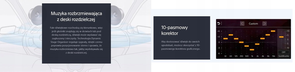 Fale dźwiękowe rozchodzą się kierunkowo, więc jeśli głośniki znajdują się w drzwiach lub pod deską rozdzielczą, dźwięk może wydawać się zagłuszony i nieczysty. Technologia Dynamic Stage Organiser reguluje sygnały, dzięki czemu poprawia pozycjonowanie stereo i sprawia, że muzyka rozbrzmiewa tak, jakby wydobywała się z deski rozdzielczej.