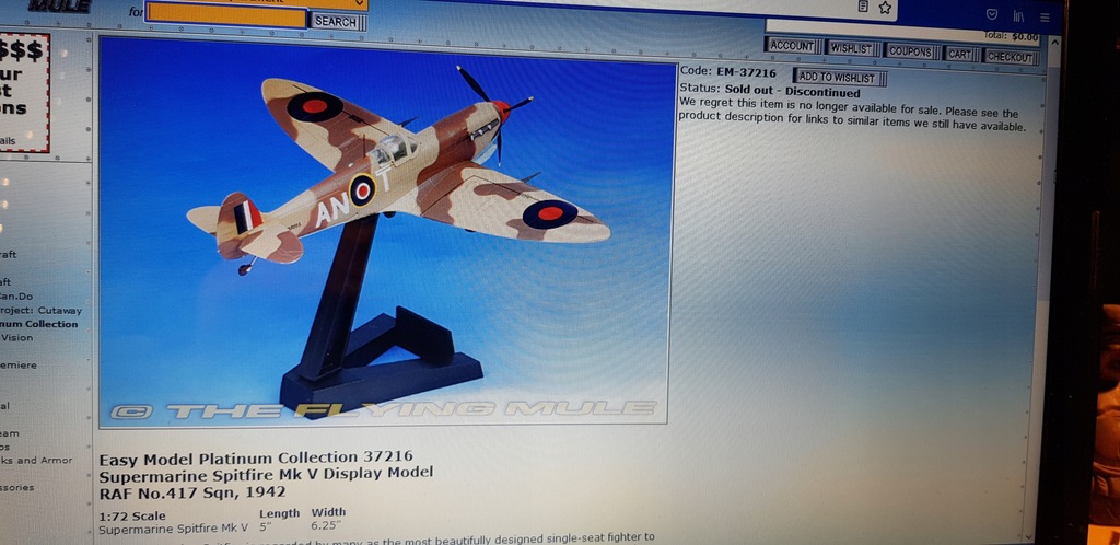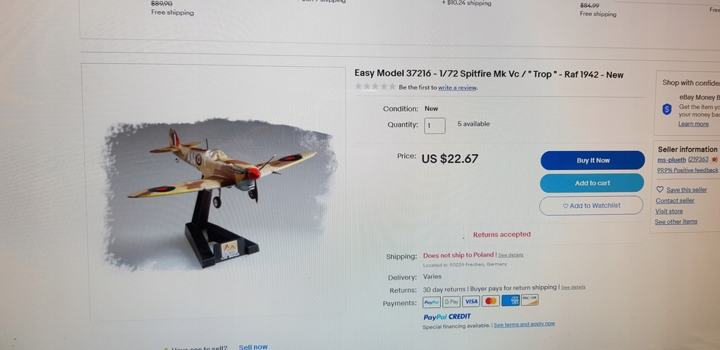 Sprzedaję model Spitfire MK V.Eeasy Model Platinum Collection 37216 .Stan idealny.Model przez lata stojący w gablocie , nie przestawiany , nie dotykany zbyt często.Brak oryginalnego opakowania .Inne modele z dużej kolekcji dostępne w innych moich ofertach Allegro.Kontakttelefoniczny 7 osiem 4 pięć 9 5 sześć 9 jeden.Modele do wysyłki pakuję z najwyższą starannością.