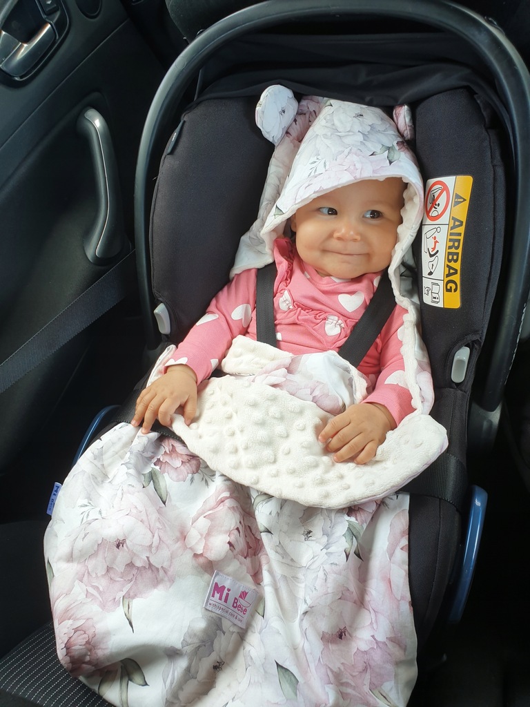 Lekki otulacz/śpiworek do fotelika samochodowego w klasie 0-13 kg, z jednej strony wysokogatunkowa tkanina z włókna bambusowego, a z drugiej miły i wysokiej jakości materiał minky lub dwustronnie tkanina bambusowa. Otulacz bez wypełnienia na okres wiosenny lub wczesna jesień