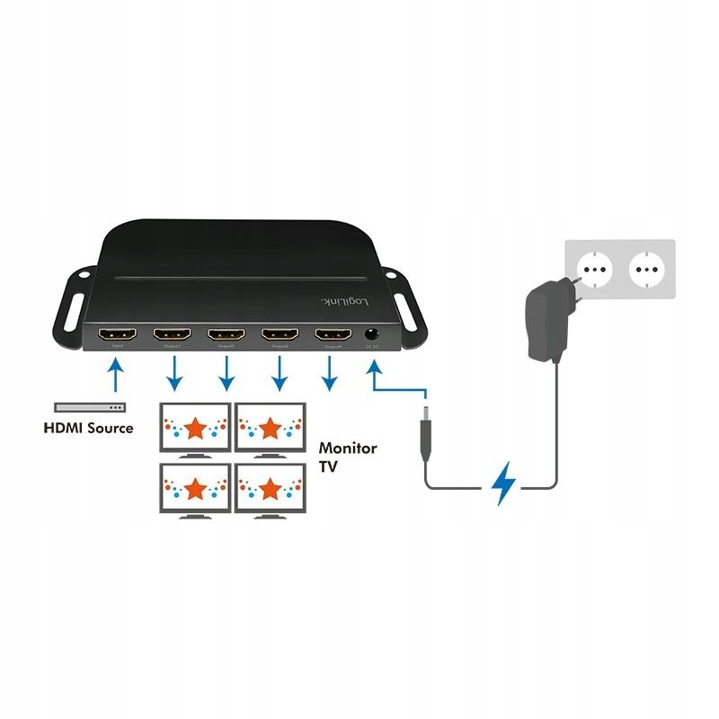 - Pozostałe parametry: Podział z jednego wejścia HDMI na cztery wyjścia HDMI, Obsługuje HDMI 2.0b i jest zgodny ze specyfikacjami HDCP 2.2, Rozdzielczość Ultra-HD dzięki technologii 4K, Wskaźniki LED stanu i urządzeń źródłowych, Wbudowany wspornik montażowy,