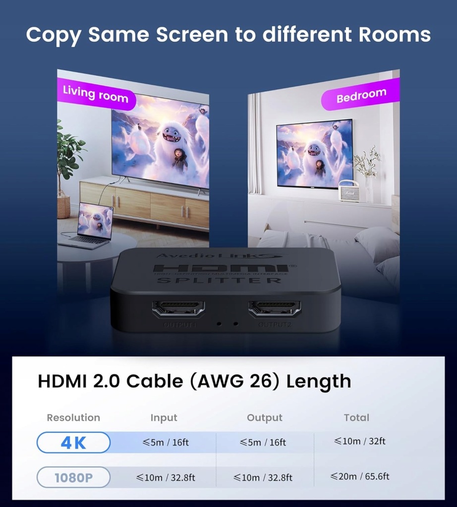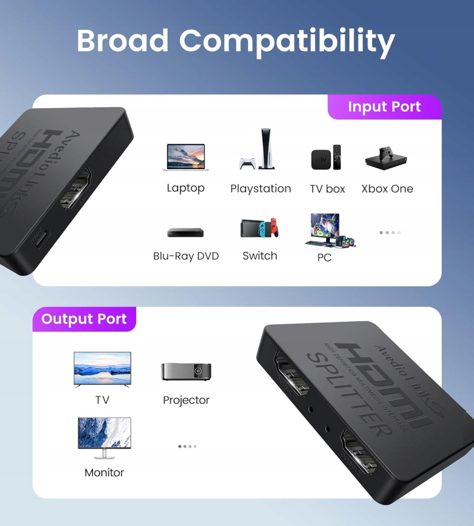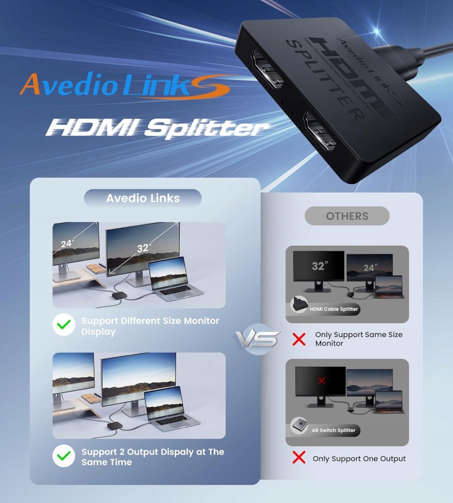 Avedio links Rozdzielacz HDMI 1 na 2 wyjścia to kompaktowe i niezawodne urządzenie, które pozwala na duplikowanie sygnału HDMI z jednego źródła na dwa monitory jednocześnie. Obsługuje rozdzielczość 4K Ultra HD (do 4K@30Hz), Full HD 1080P, a także formaty 3D, zapewniając wysoką jakość obrazu. Dzięki funkcji wzmacniacza sygnału i prostej obsłudze Plug & Play, jest idealnym rozwiązaniem do prezentacji, domowej rozrywki czy monitoringu, nie wymagając instalacji żadnych sterowników.