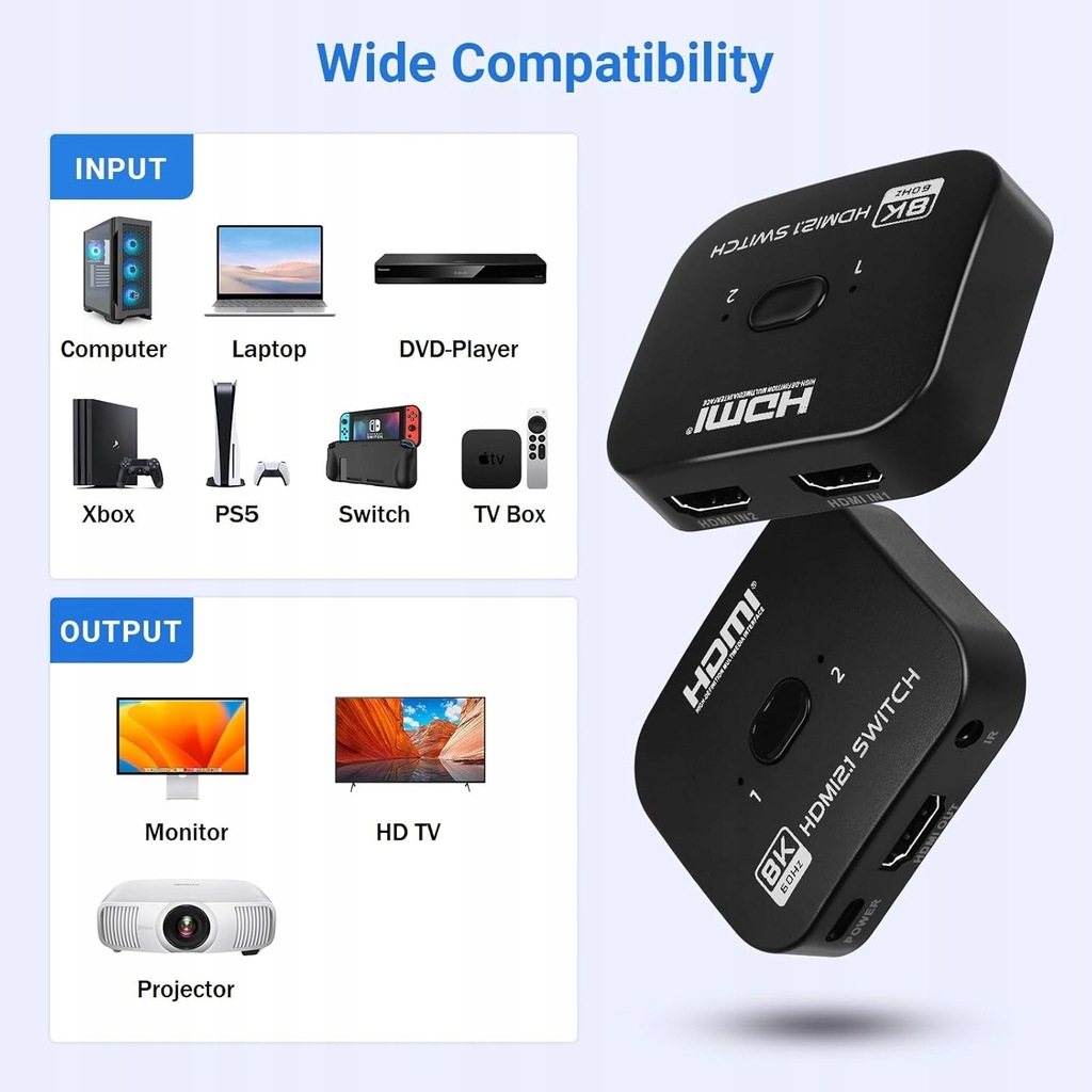 Ten przełącznik HDMI obsługuje 8K 60Hz, 4K 120Hz, 2K, 1080P przy 144Hz, rozdzielczość 3D i dźwięk HD, zapewniając wysokiej jakości obrazy. Podczas korzystania z tego przełącznika w rozdzielczości 8K należy użyć standardowych kabli HDMI 2.1, aby podłączyć urządzenia wejściowe HDMI (takie jak XBox, PS4) do monitora i przełącznika HDMI.