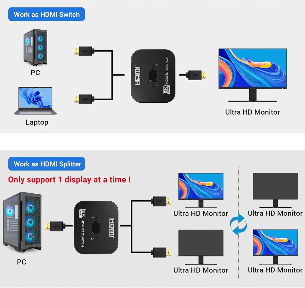 Dzięki temu rozdzielaczowi HDMI możesz podłączyć 2 źródła HDMI do 1 wyświetlacza HDMI lub podłączyć 1 źródło HDMI, aby przełączać się między 2 ekranami