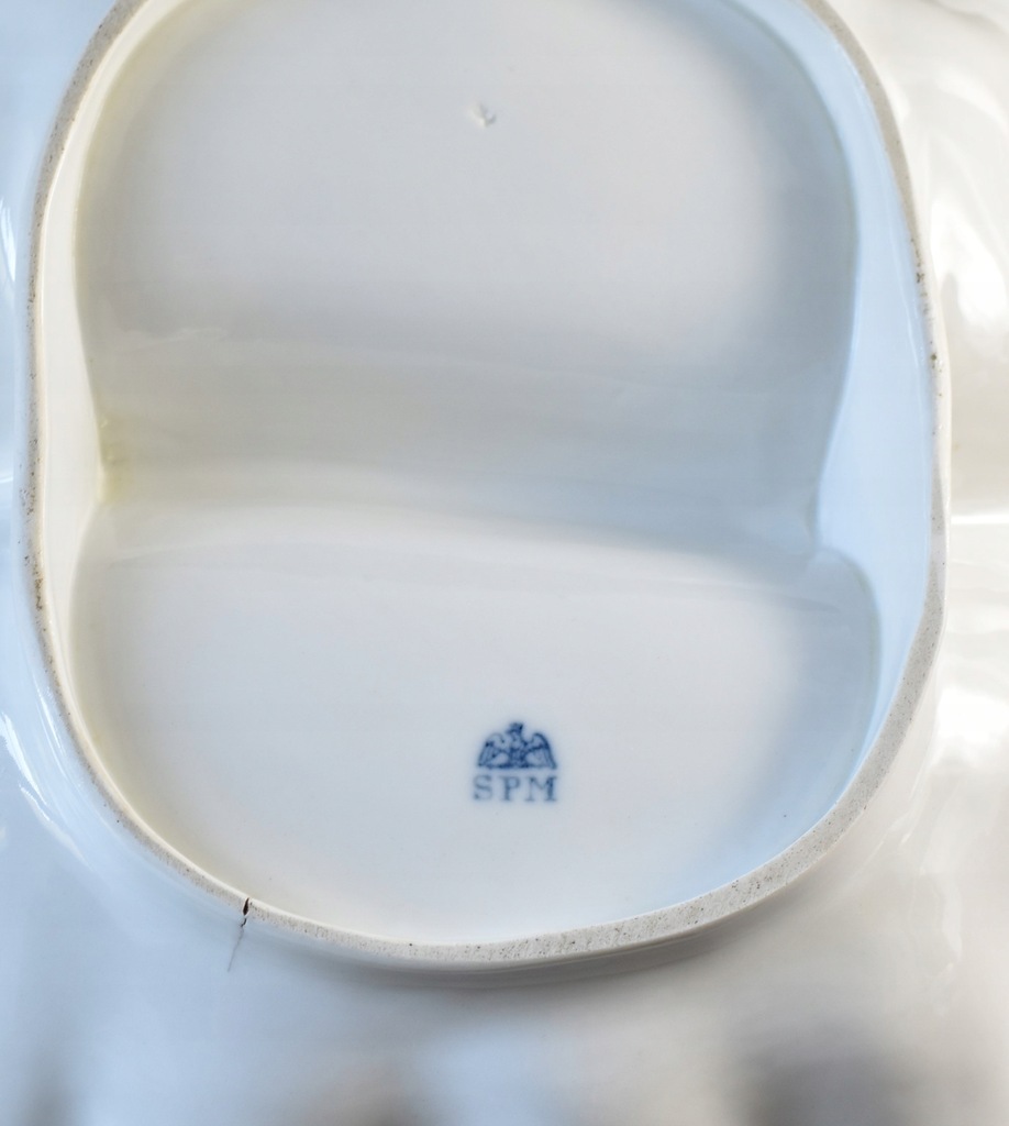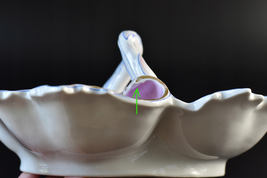 Stan: bardzo dobry z niewielkimi śladami użytkowania; przy podstawie jedna nieduża rysa, która powstała jeszcze w trakcie wypalania porcelany w manufakturze; w jednym miejscu na zawinięciu porcelany od spodu mały, płaski uszczerbek (zaznaczone na ostatnim zdjęciu), mógł również powstać w trakcie produkcji.