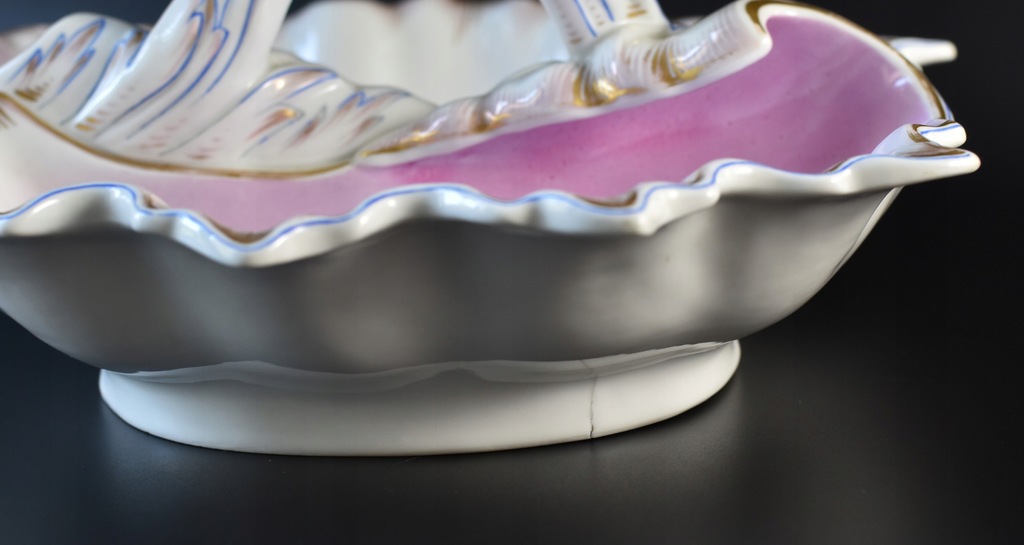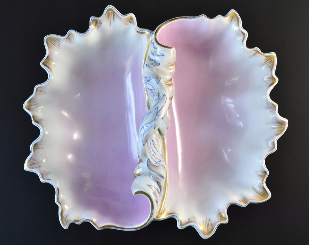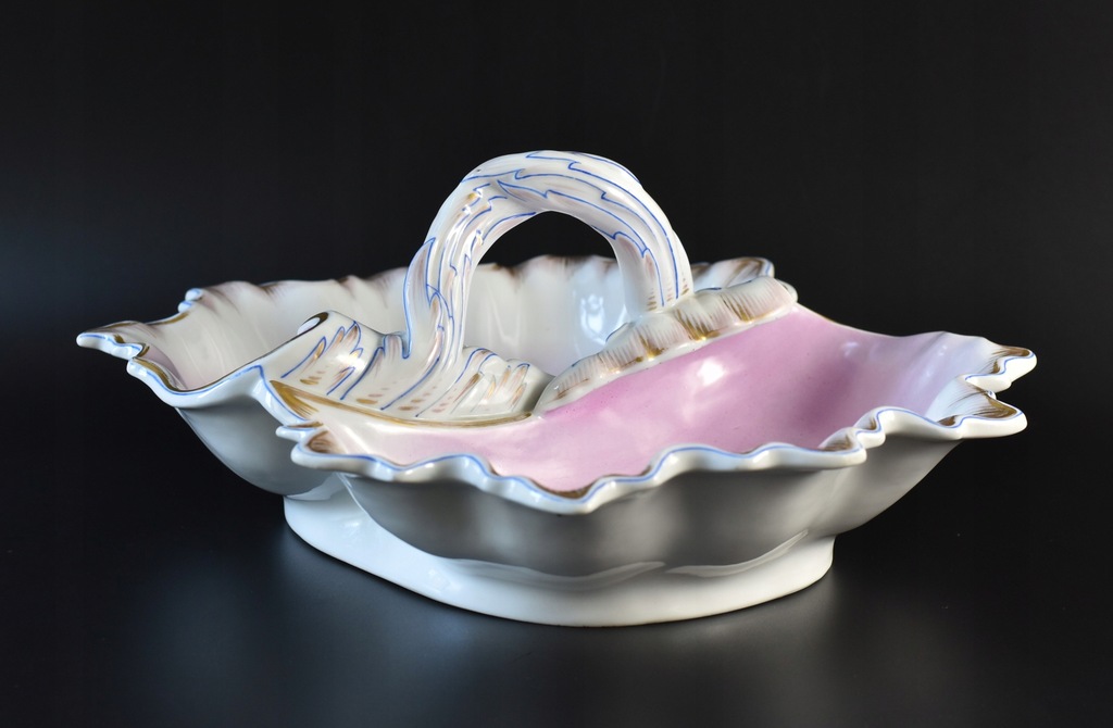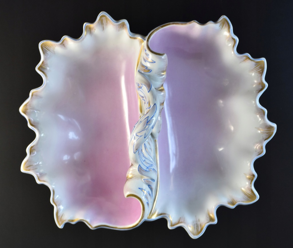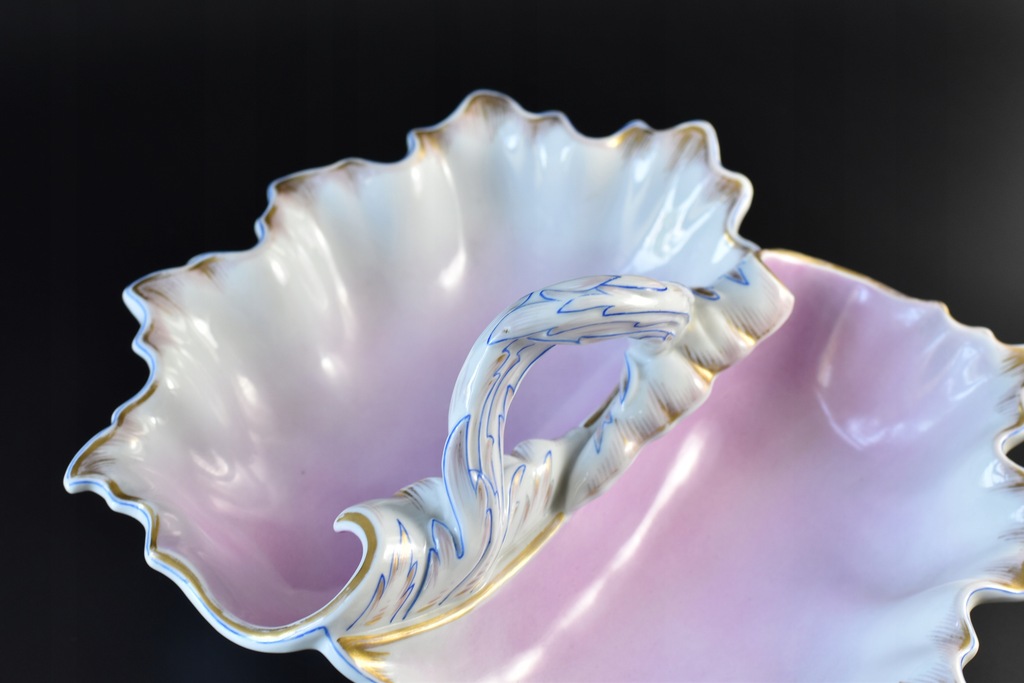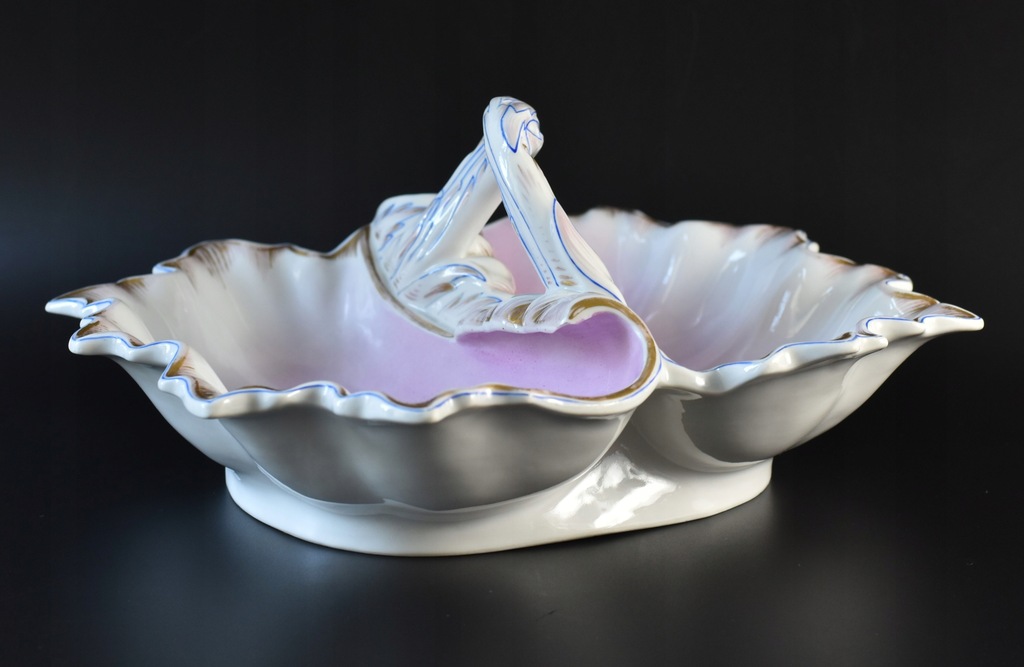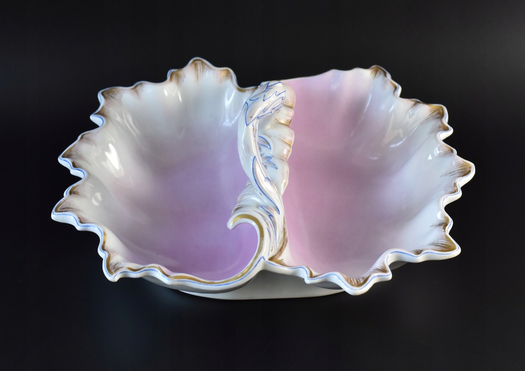 Wyjątkowa forma kabaretu przypomina dwie otwarte i złączone ze sobą muszle. Delikatne różowe wnętrze podkreślone złoceniami w towarzystwie lekkiej, niebieskiej kreski. Całość ręcznie malowana.