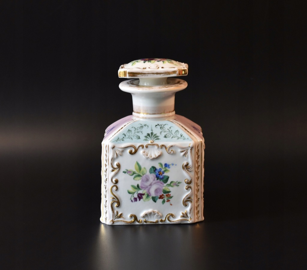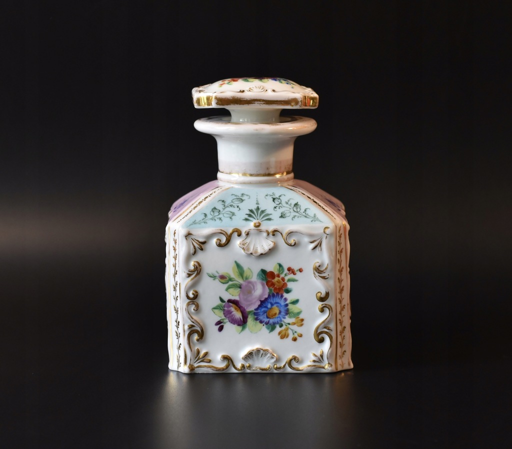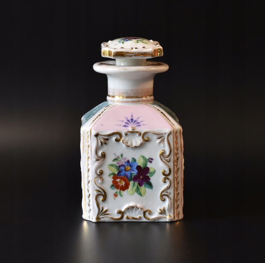 Stan: pojemnik jest bardzo ładnie zachowany, miejscowo widoczne nieduże ślady użytkowania czy przetarcia złoceń; korek ma w dolnej części niewielkie uszkodzenie.