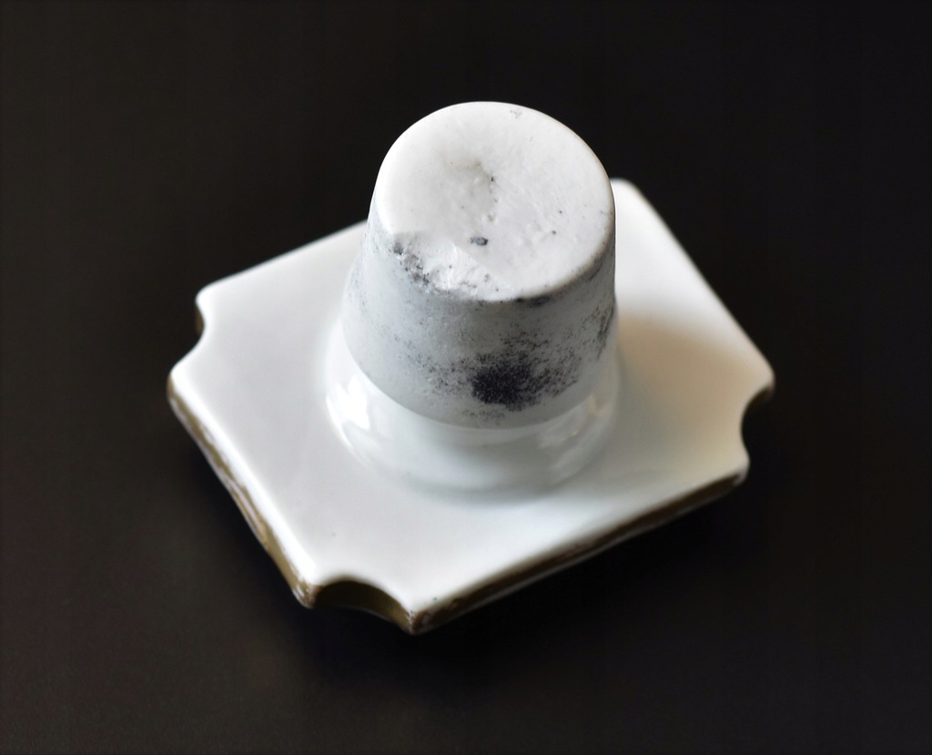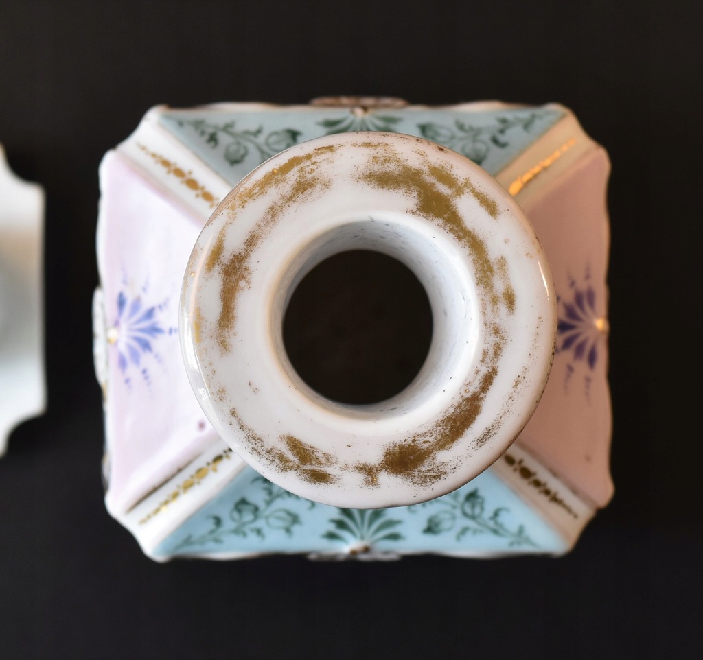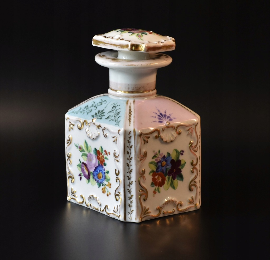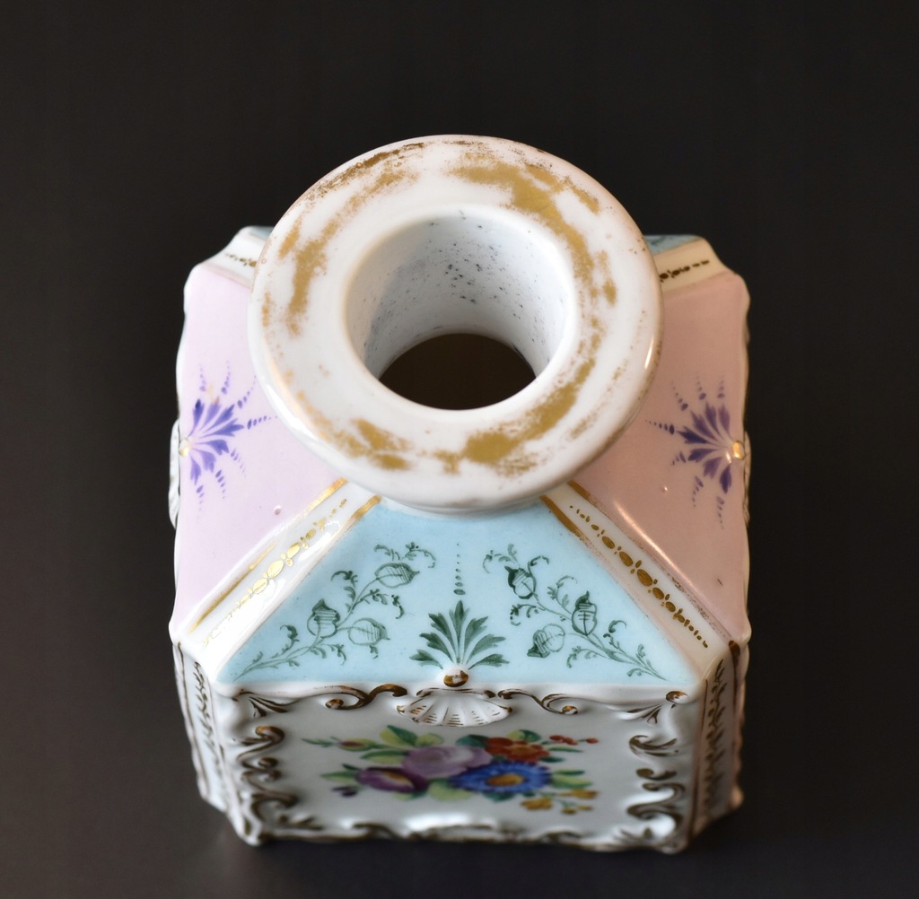 Stan: pojemnik jest bardzo ładnie zachowany, miejscowo widoczne nieduże ślady użytkowania czy przetarcia złoceń; korek ma w dolnej części niewielkie uszkodzenie.