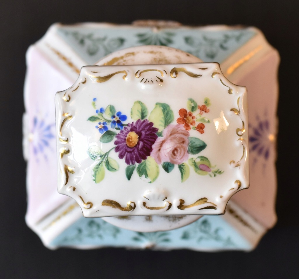 Porcelana zdobiona bukietami kolorowych kwiatów, otoczonych delikatnymi, złoconymi reliafami oraz turkusowymi i różowymi akcenatami. Całość ręcznie malowana.