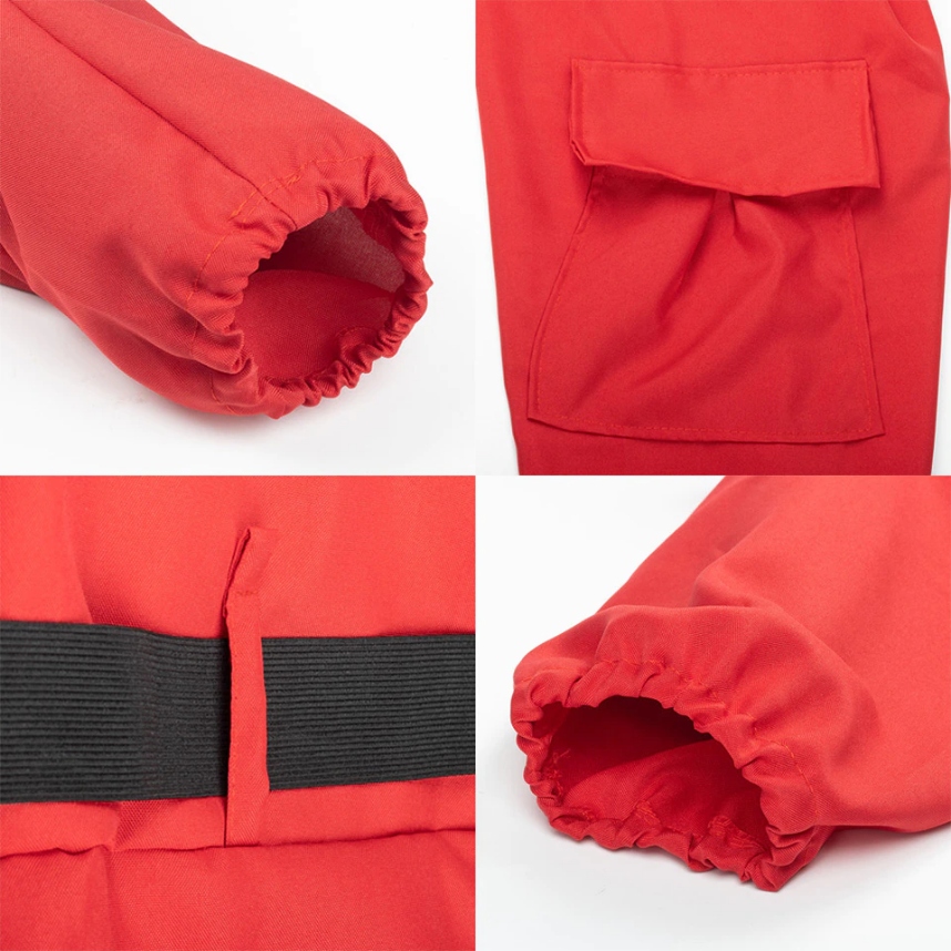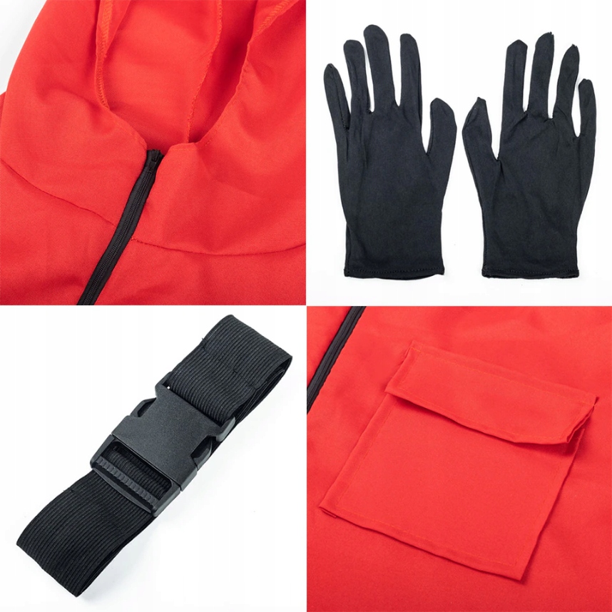 Jednoczęściowy charakterystyczny, czerwony kombinezon zapinany na suwak (zamek błyskawiczny) z kapturem.