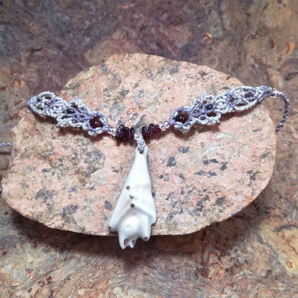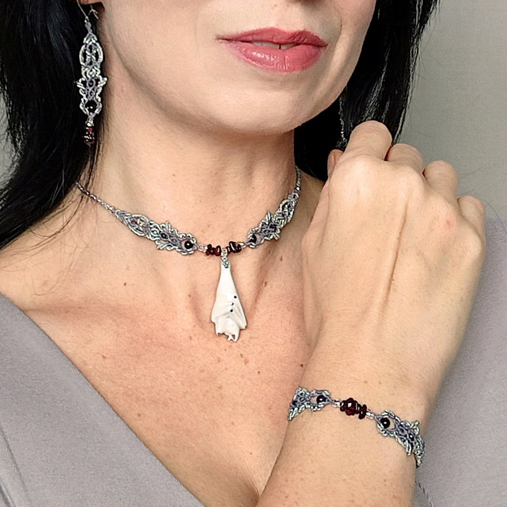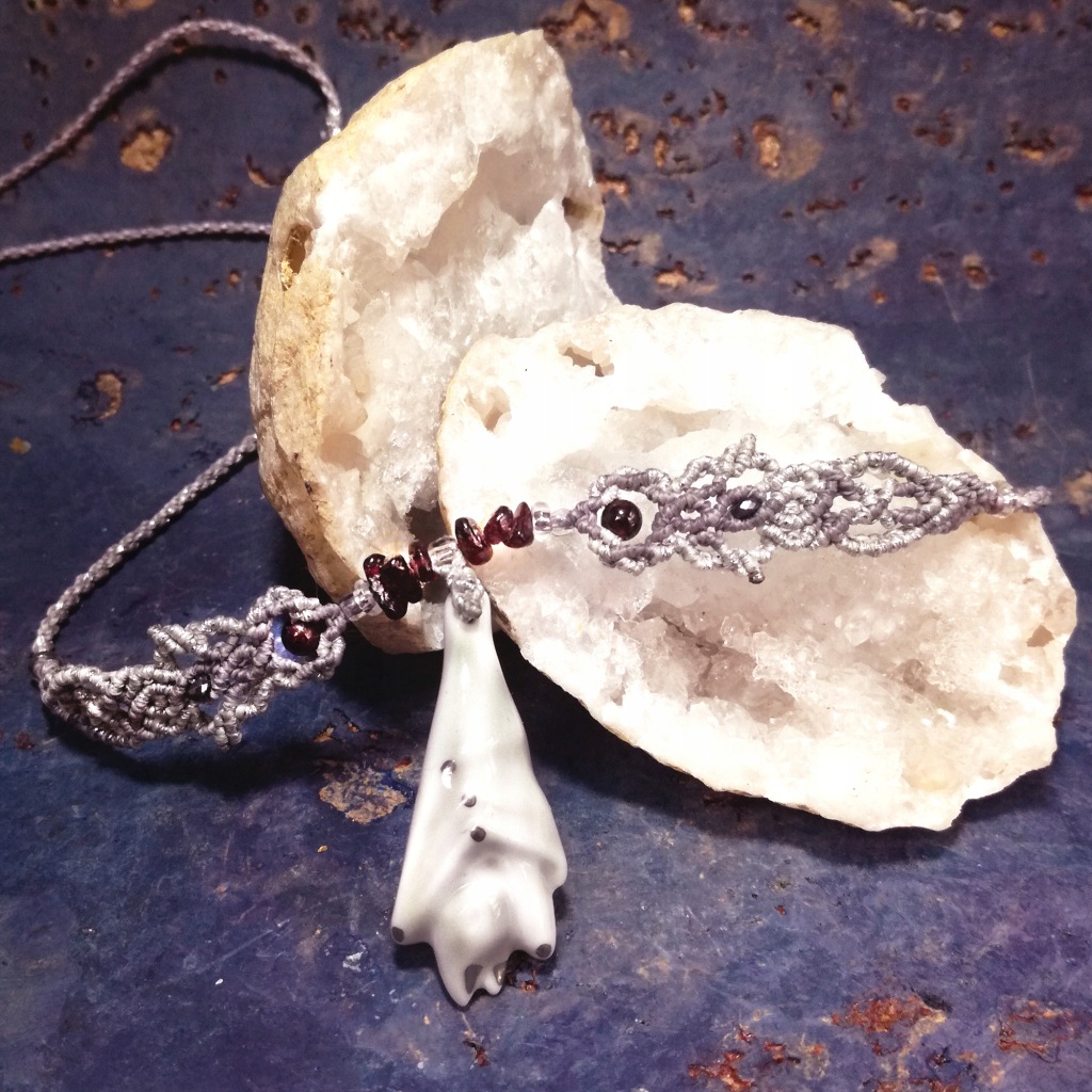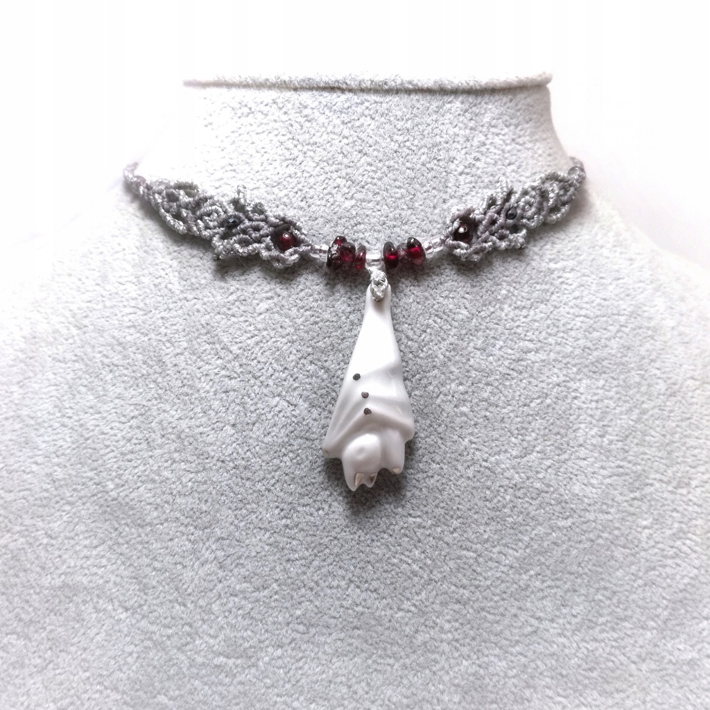 Użyte kamienie to: granat (bryłki) , hematyt. Wisiorek z nietoperzem o wymiarach 4 x 2,8 cm wykonany jest z porcelany szkliwionej z dodatkiem platyny.