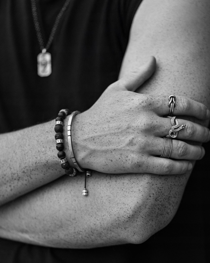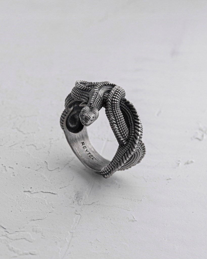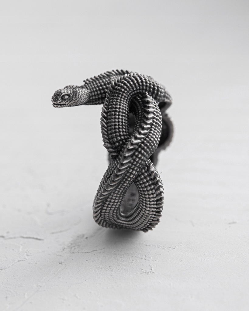 Srebrny pierścień "JÖRMUNGANDR" to symbol potęgi, nieskończoności i nieuniknionego przeznaczenia. Jego projekt jest inspirowany postacią Jörmungandra – wielkiego Węża Świata z mitologii nordyckiej, który otacza cały ocean, gryząc własny ogon.