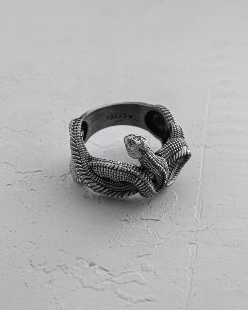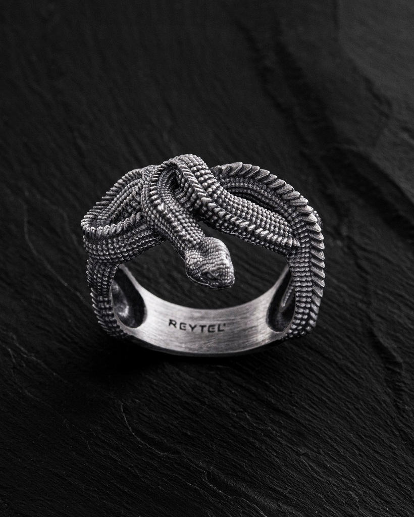 Srebrny pierścień "JÖRMUNGANDR" to symbol potęgi, nieskończoności i nieuniknionego przeznaczenia. Jego projekt jest inspirowany postacią Jörmungandra – wielkiego Węża Świata z mitologii nordyckiej, który otacza cały ocean, gryząc własny ogon.