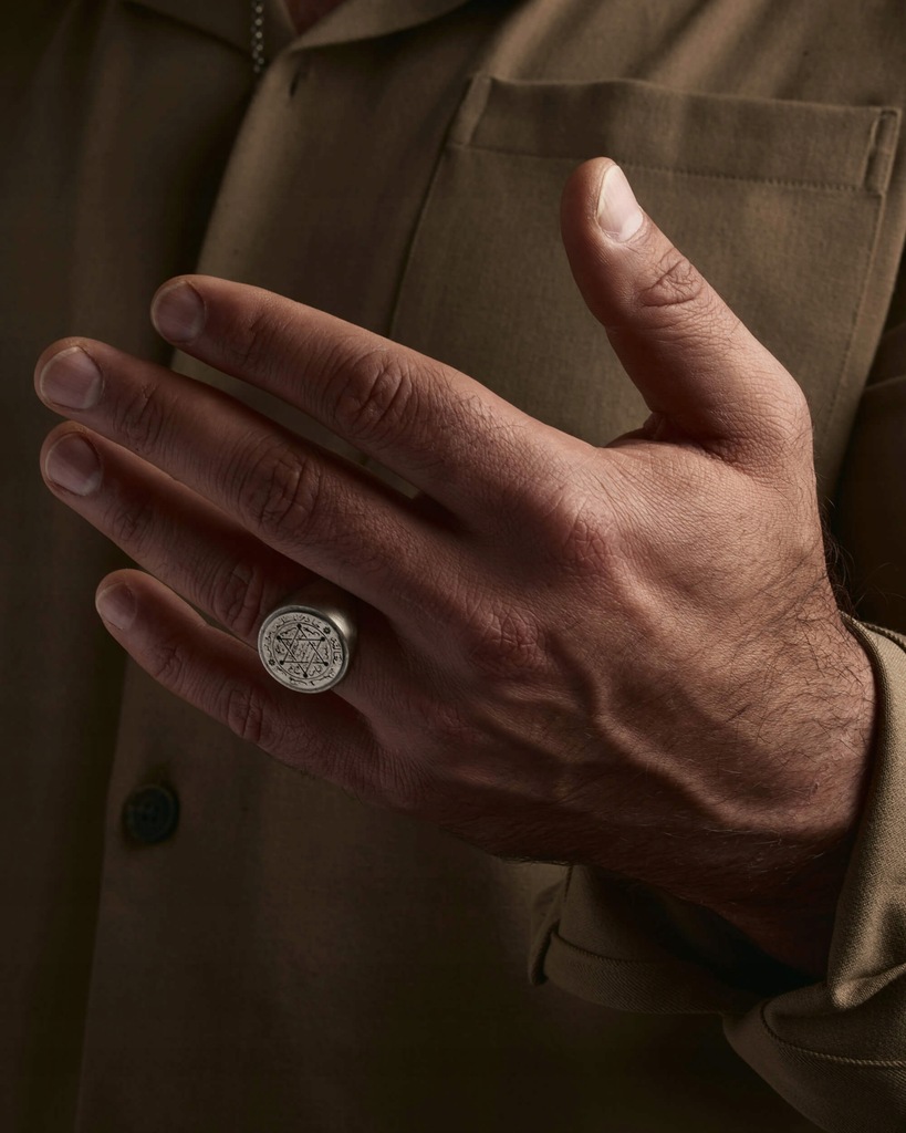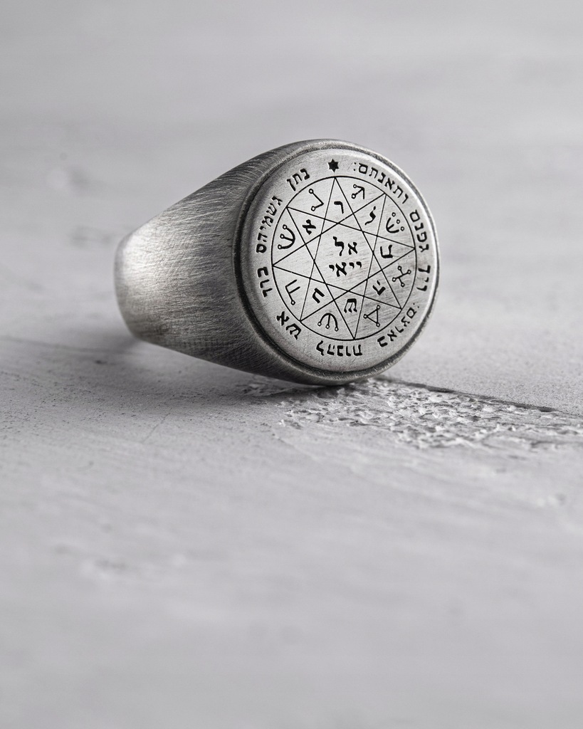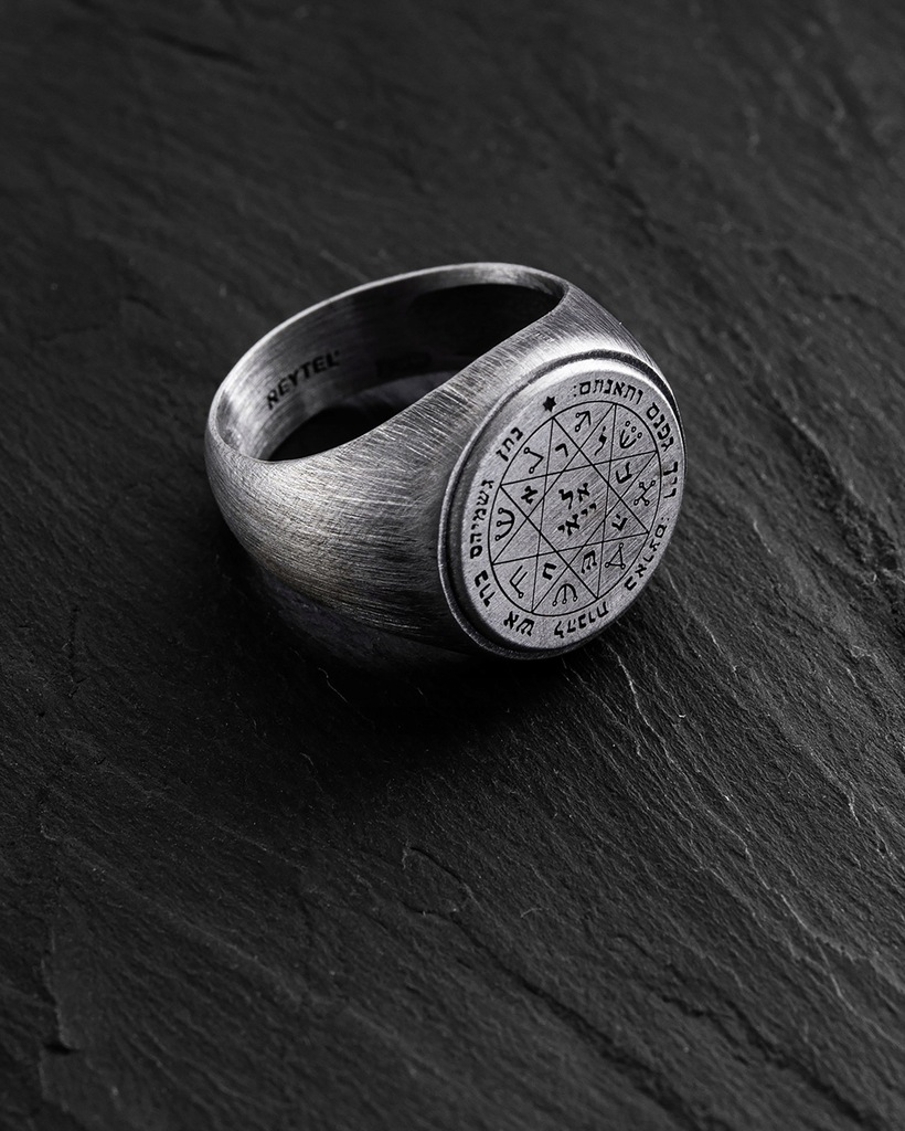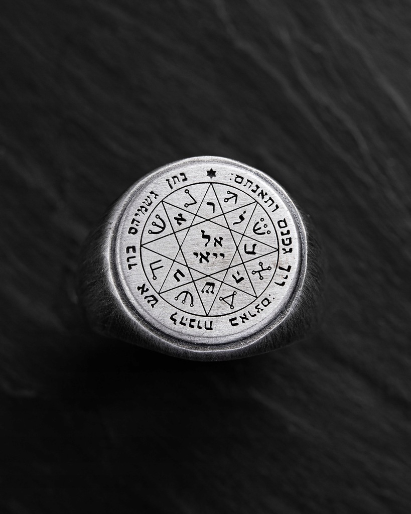 Design pierścienia zawiera symbole "Pieczęci Salomona", które symbolizują duchową władzę i ochronę. Uważa się, że te symbole dają mądrość i autorytet.
