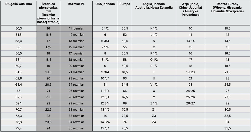 Skorzystaj z tabeli rozmiarów znajdującej się na dole tej strony. Porównaj swój rozmiar z najbliższym w pierwszej kolumnie (zatytułowanej „Długość pierścionka, mm”), a następnie znajdź odpowiedni rozmiar w kolumnie „Rozmiar pierścionka na naszej stronie internetowej”.