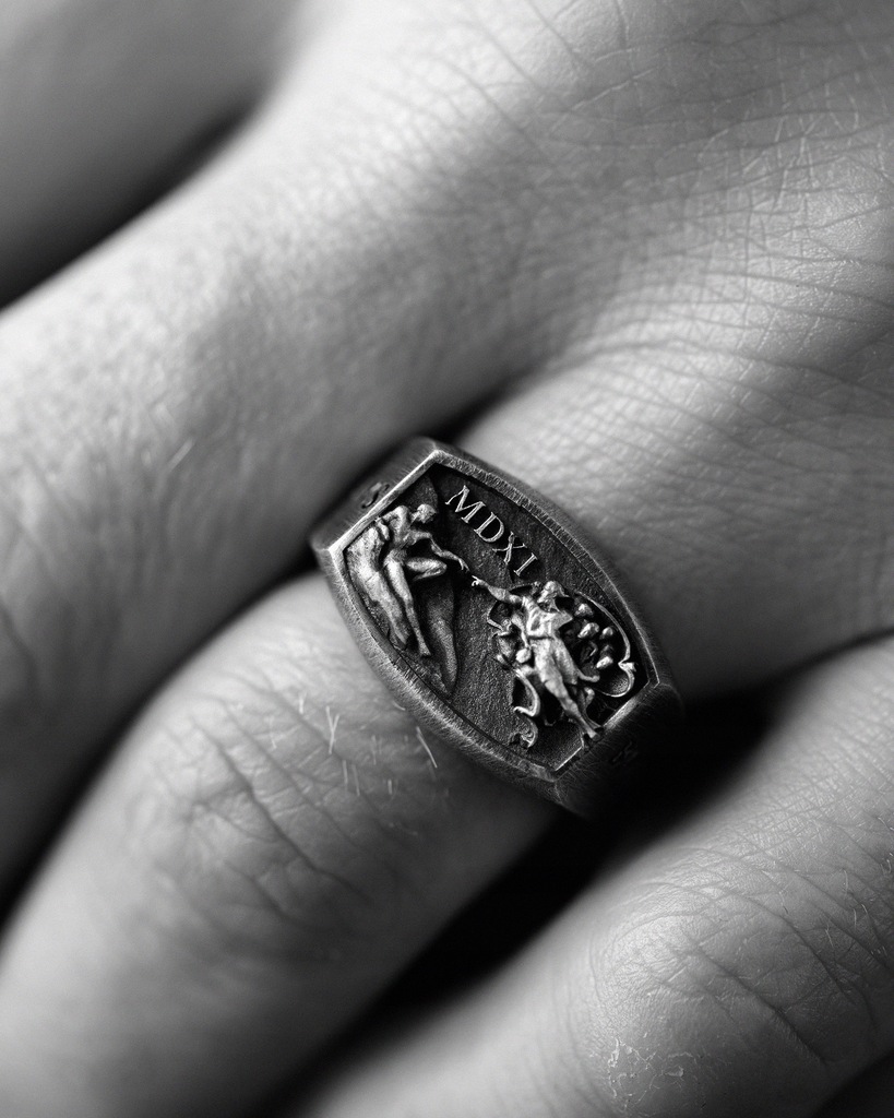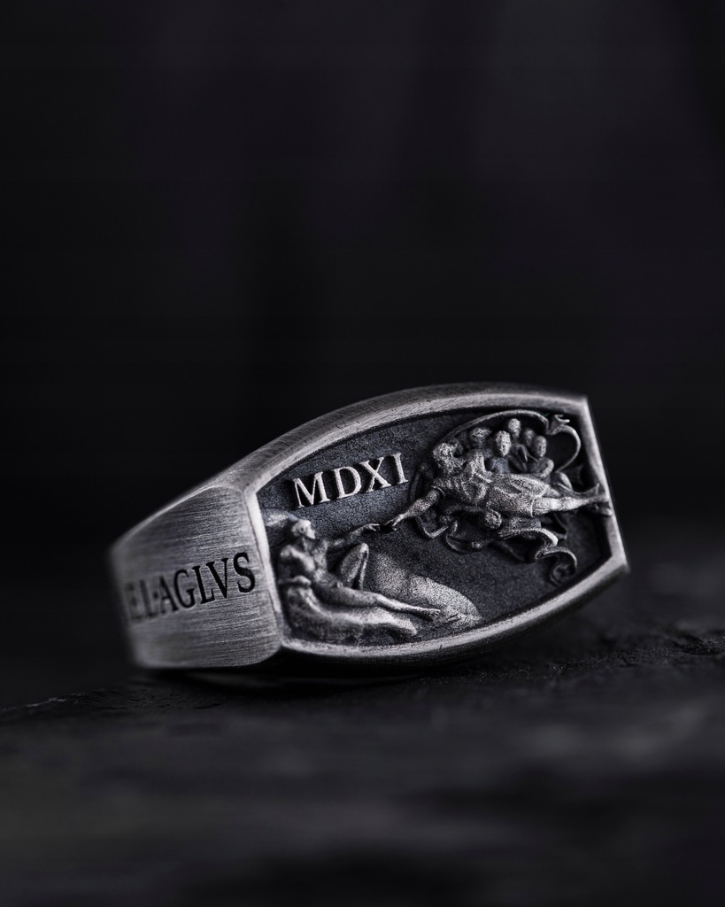 Srebrny pierścień "STWORZENIE ADAMA - MICHELANGELO" to przedstawienie jedno z najsłynniejszych dzieł sztuki na świecie. Ta męska biżuteria to ukazanie ozdobionej sceny z fresku Michała Anioła "Stworzenie Adama", to akt boskiego stworzenia i dotyk Boga do człowieka. Ten kultowy obraz jest ikoną z czasów renesansów, symbolizuje energię życiową, duchowość i nieograniczone możliwości ludzkości. Ta biżuteria pomaga sile tworzącej w rozwój, duchowej więzi i dążeniu do doskonalenia. To nie tylko wyrafinowana biżuteria, ale także potężny symbol ludzkiej natury, inspiracji i wiary we własne możliwości.