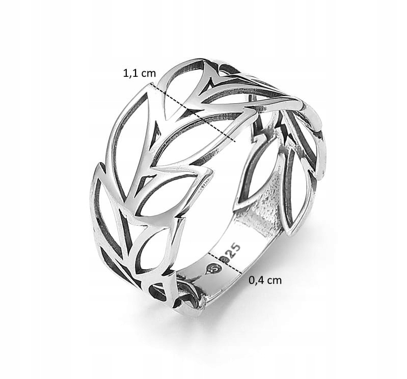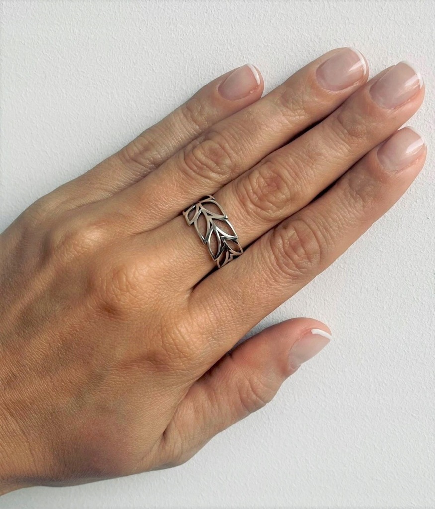 Bardzo efektowny srebrny pierścionek z motywem listków.